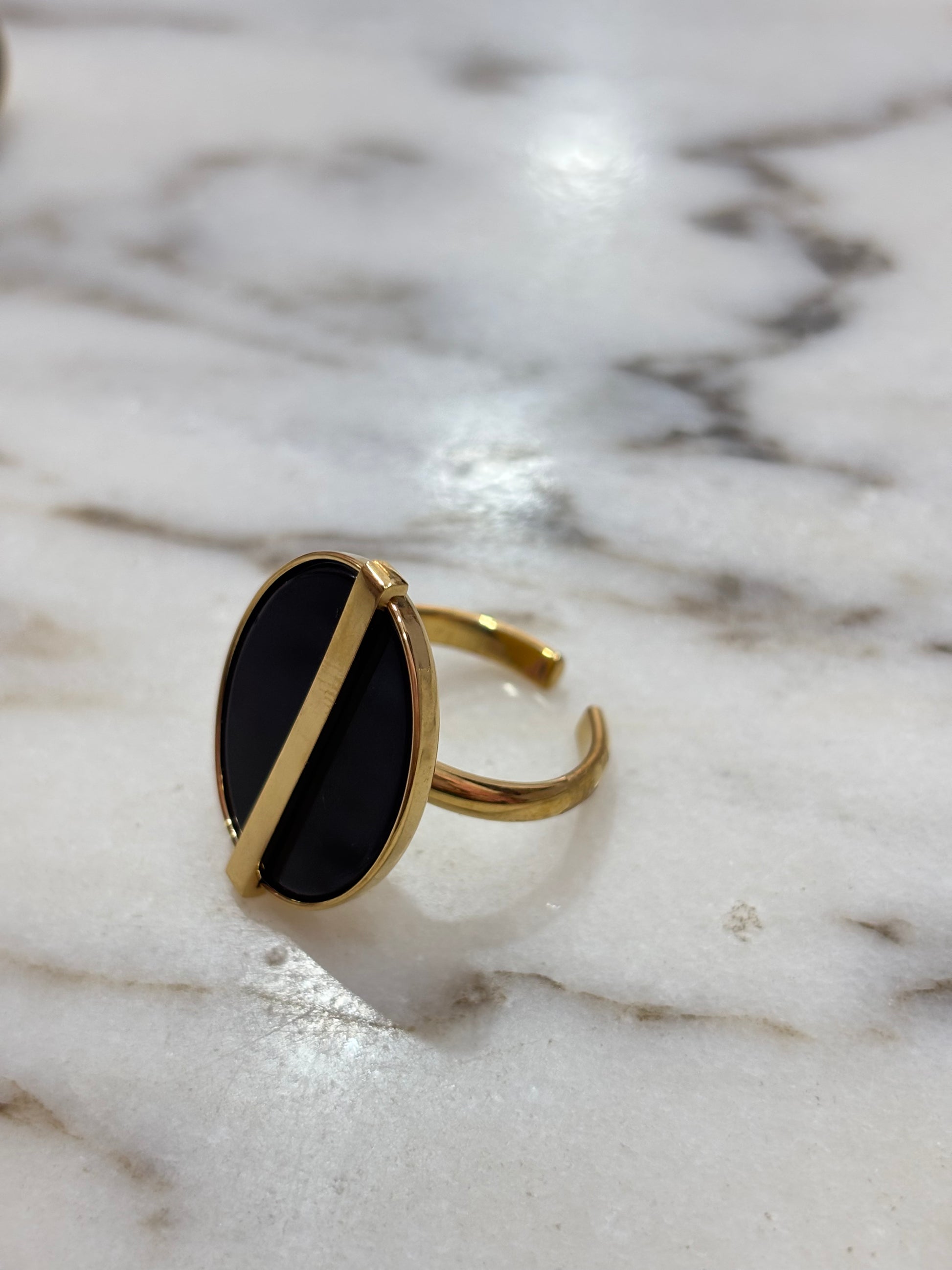 Anillo dorado con piedra negra , con abertura para mejor adaptación al dedo.Hecho en acero quirúrgico y libre de niquel.