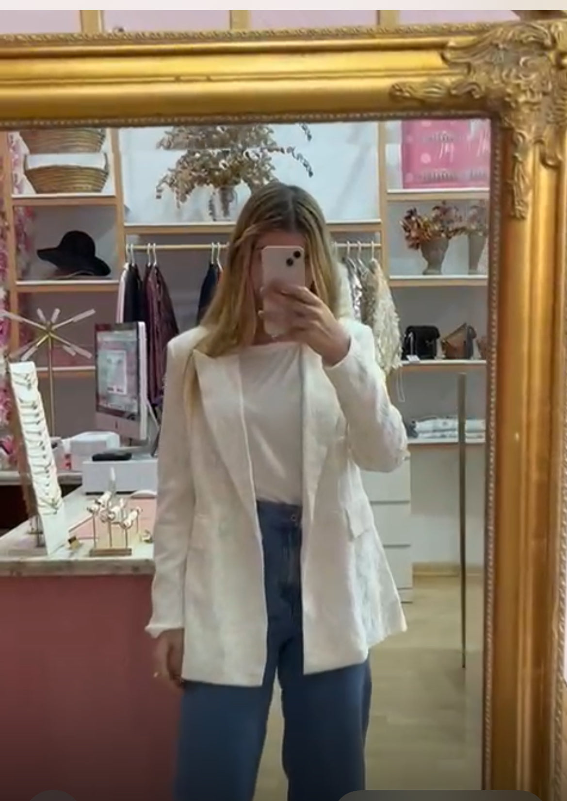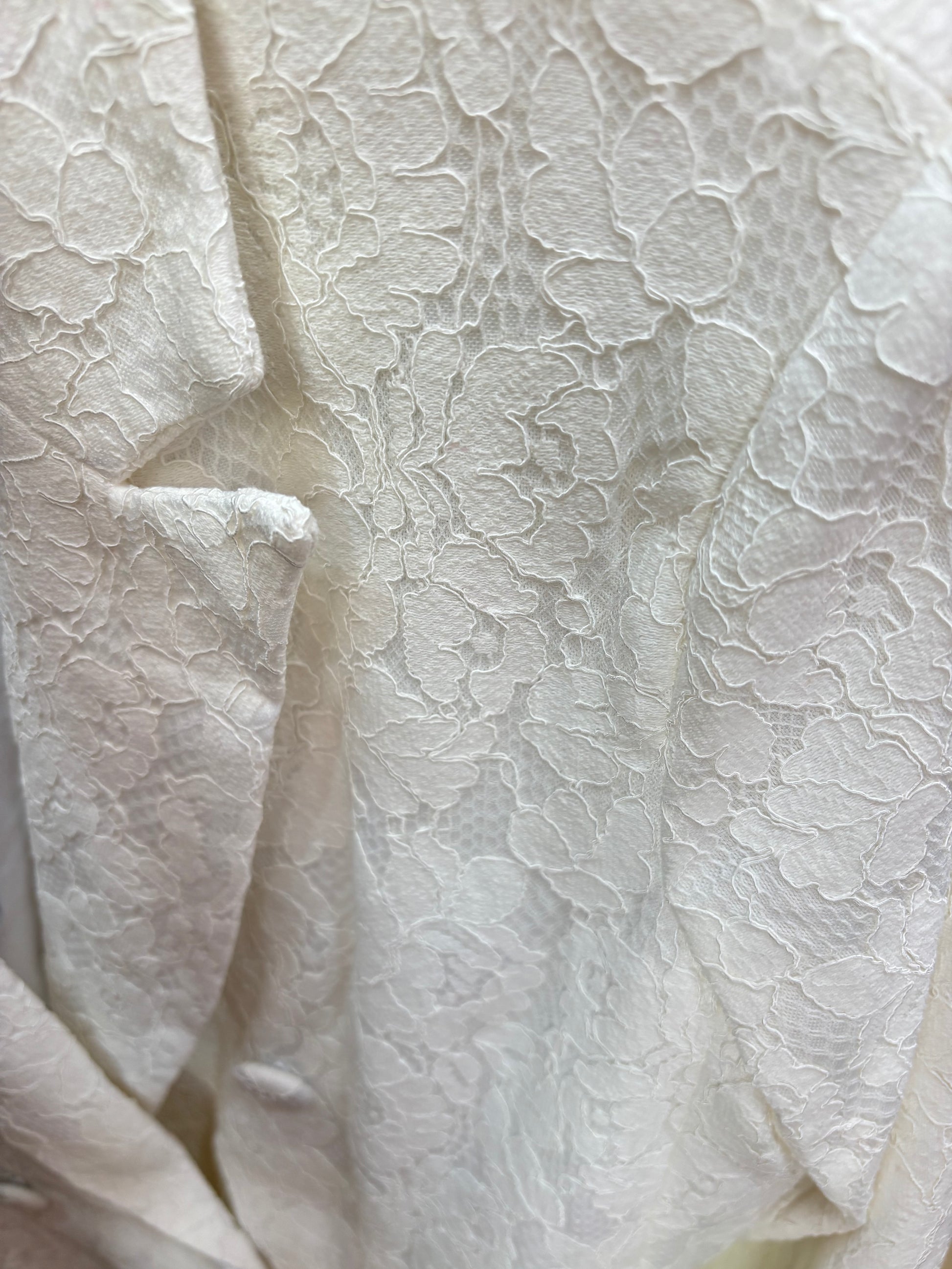 Blazer de encaje color blanco cruzada y botones forrados. La chaqueta se encuentra totalmente forrada y con hombreras.