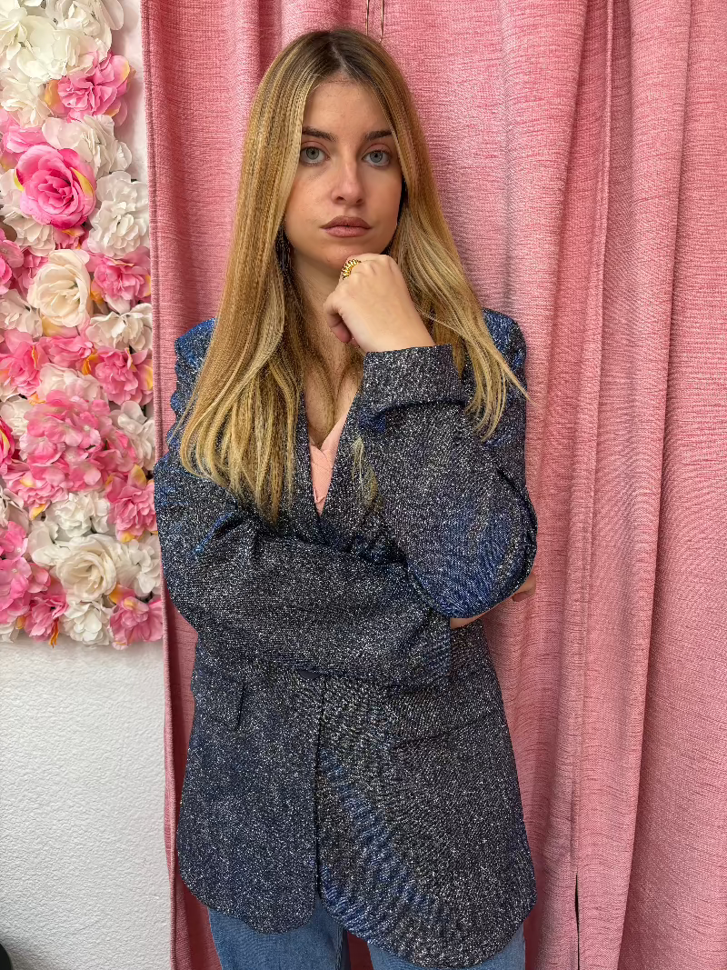 Blazer de brillo en color azul tejano . Cuello solapa y cierre con un botón