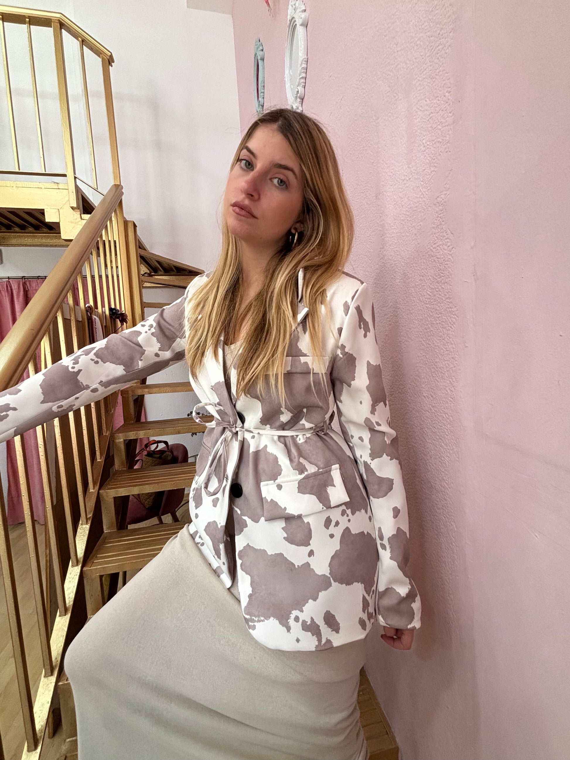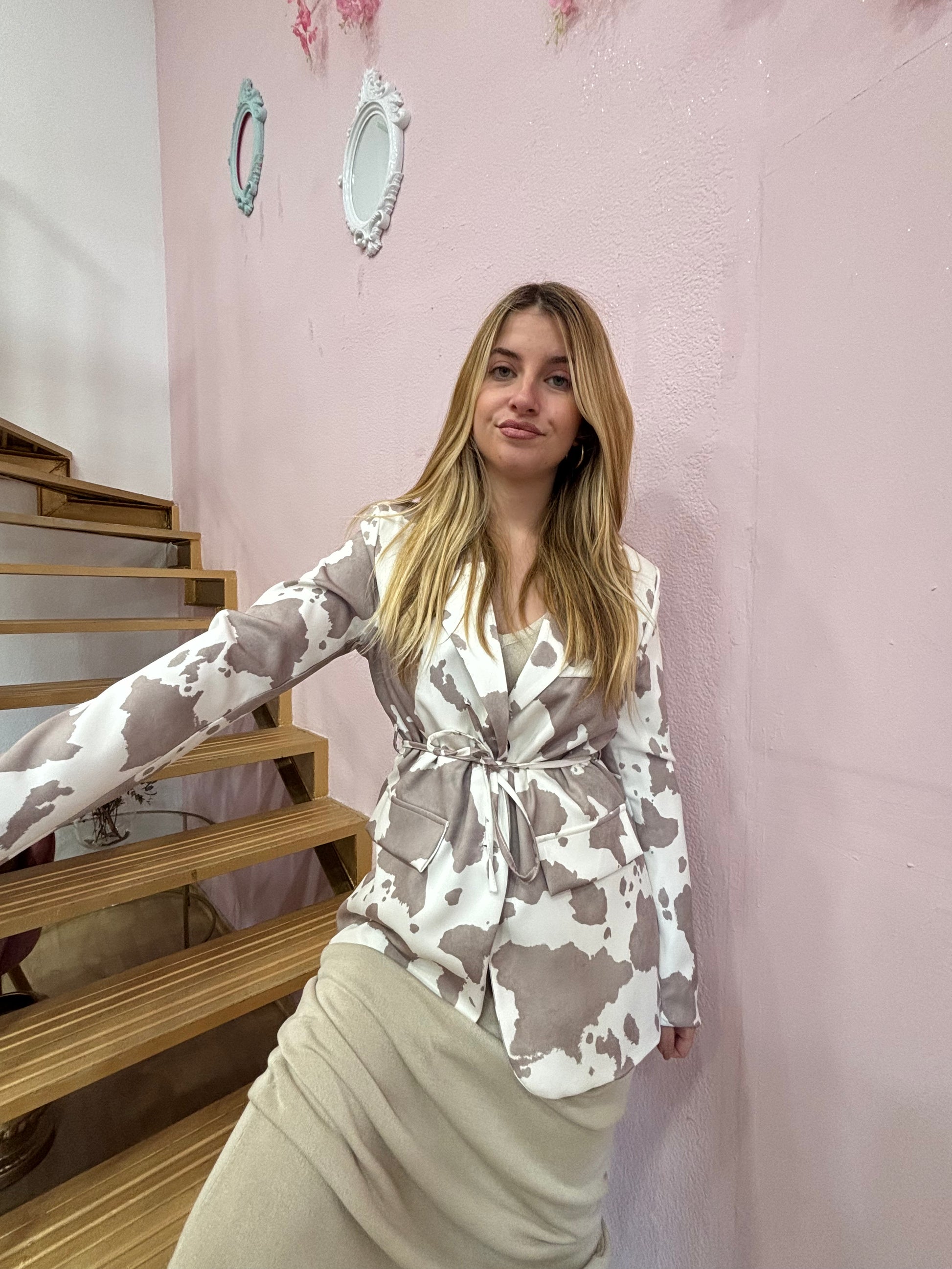 Chaqueta de tejido satinado con estampado de vaca en color tostado y blanco. Con cinturón de la misma tela y abotonado, Talla única 38-42 aprox.Dos tonos topo y marrón