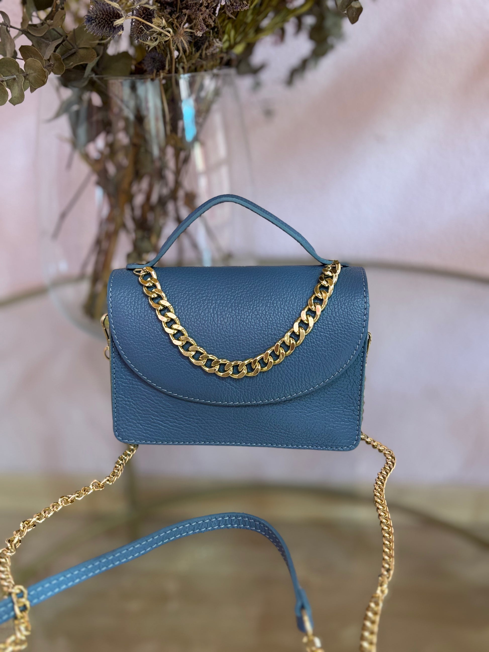 Bolso de piel de color azul con doble asa , uno de cadena y la larga de cadena y piel. Medidas :19x14x6´5 cm