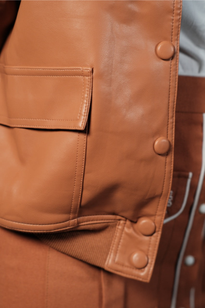 Bomber de cuero.Color caldera. Cuello a la caja con terminación de punto elástico. Talla S/M y M/L