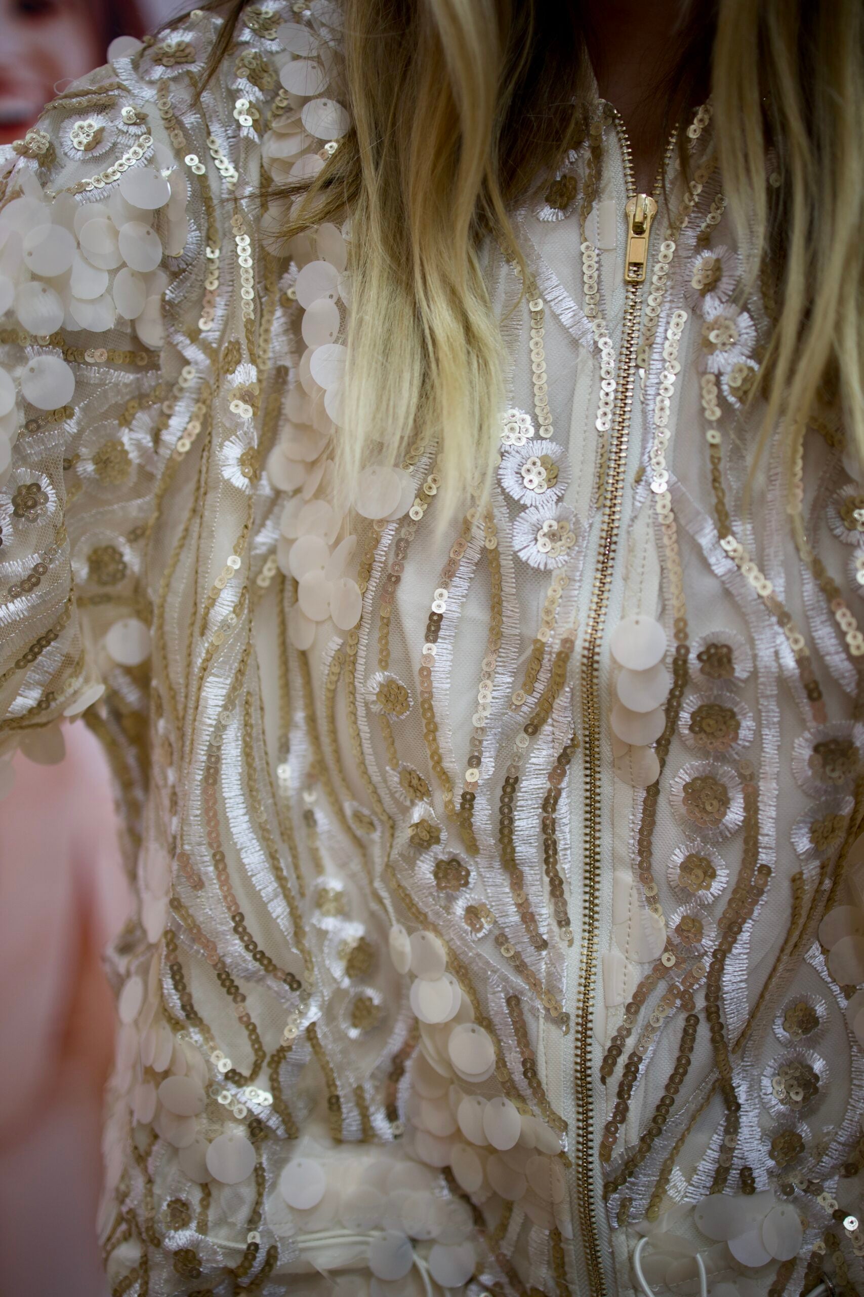 Bomber de color beige ,toda de lentejuelas .Cierre con cremallera y se ajusta a la cintura con cordón elástico, Cuello a la caja.