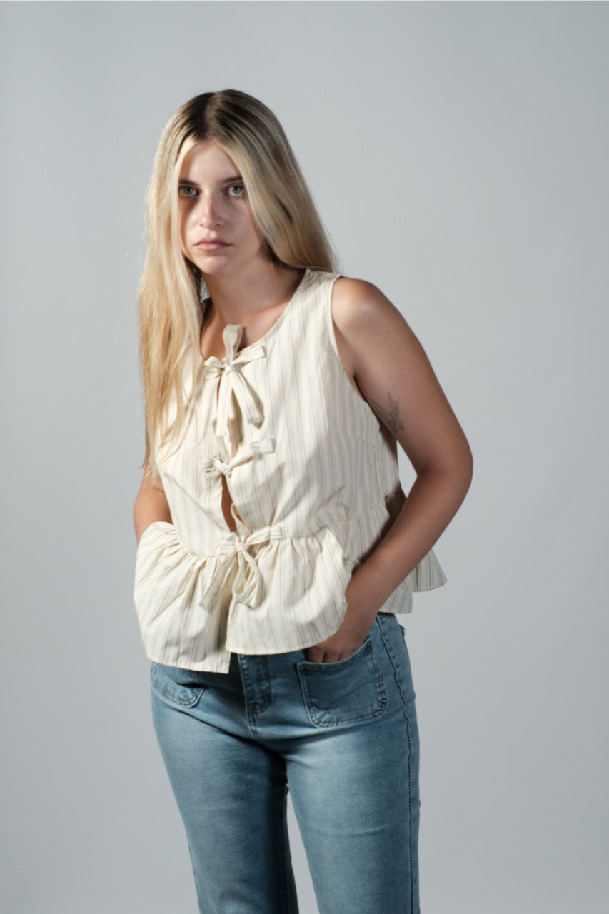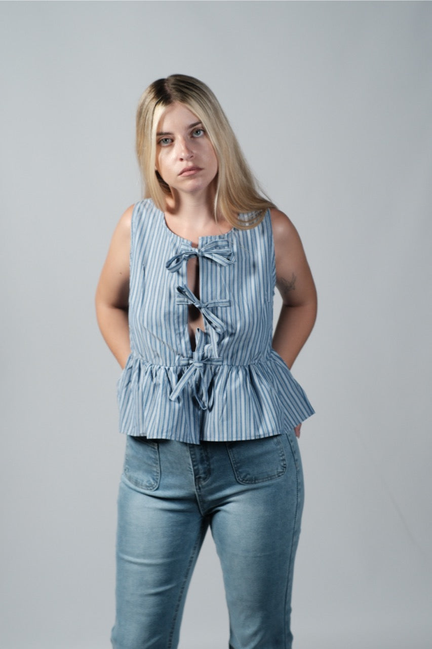 Blusa sin mangas , abrochada en el delantero con lazada.Corte peplum. Talla S/M y M/L