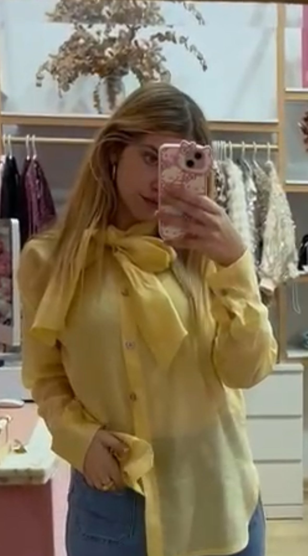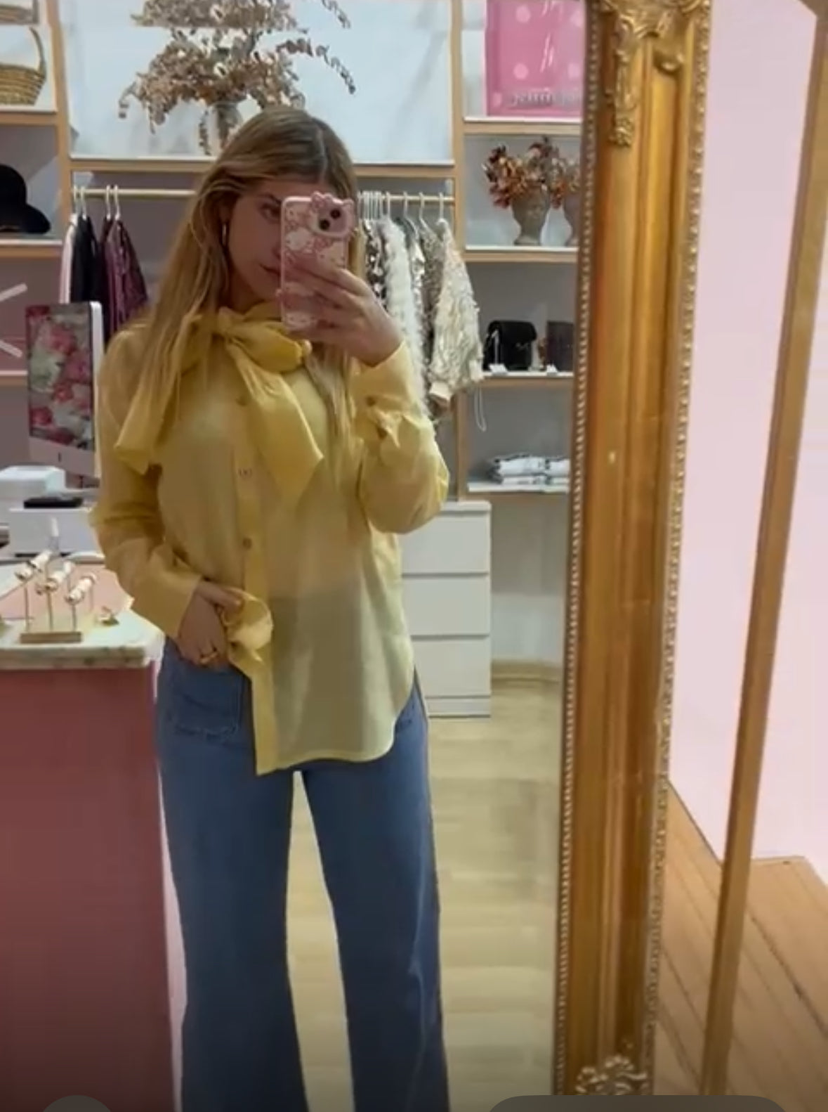 Camisa fluida de color amarillo pastel, con lazada en el cuello. Talla única 36-42 aprox .