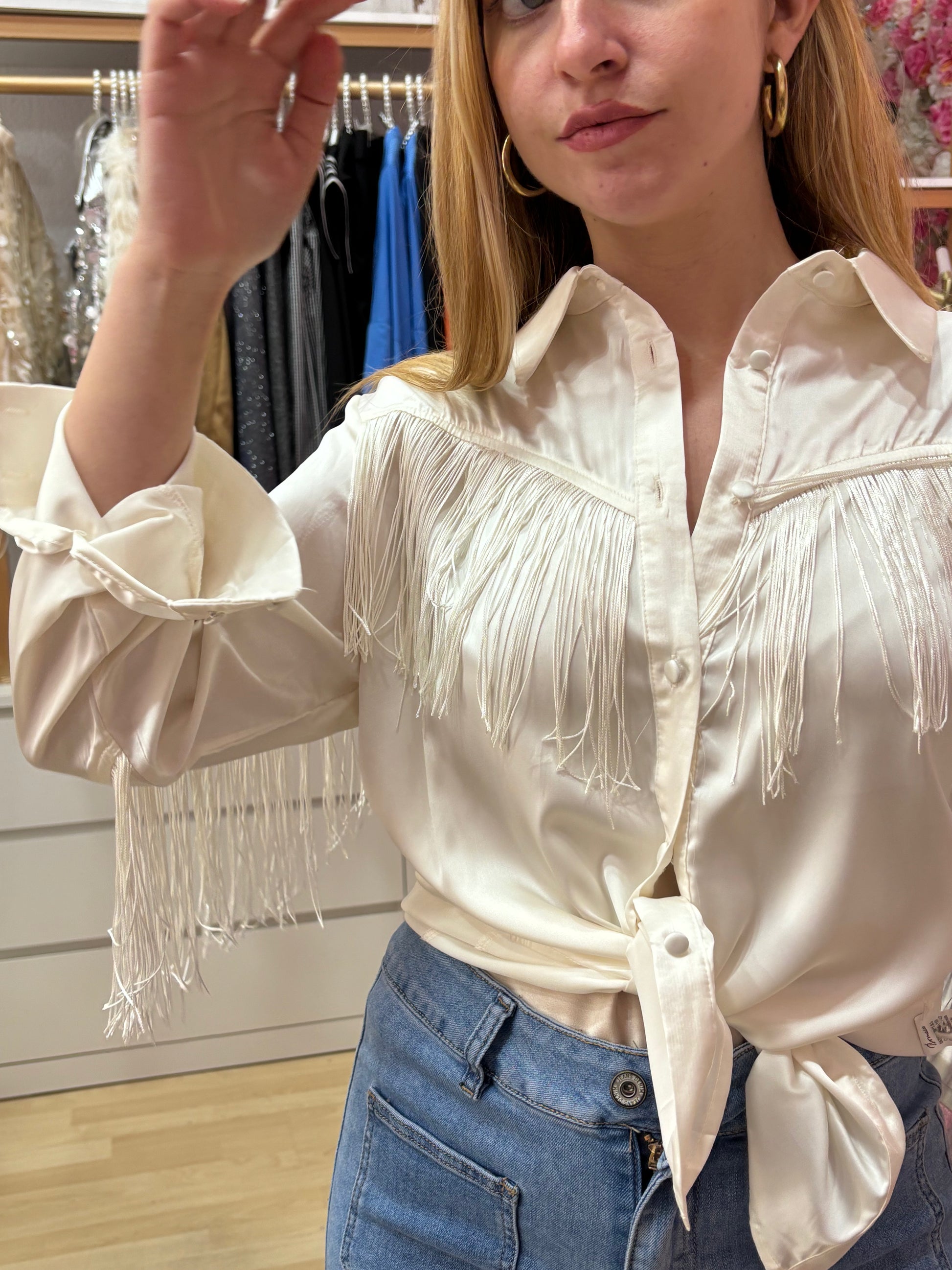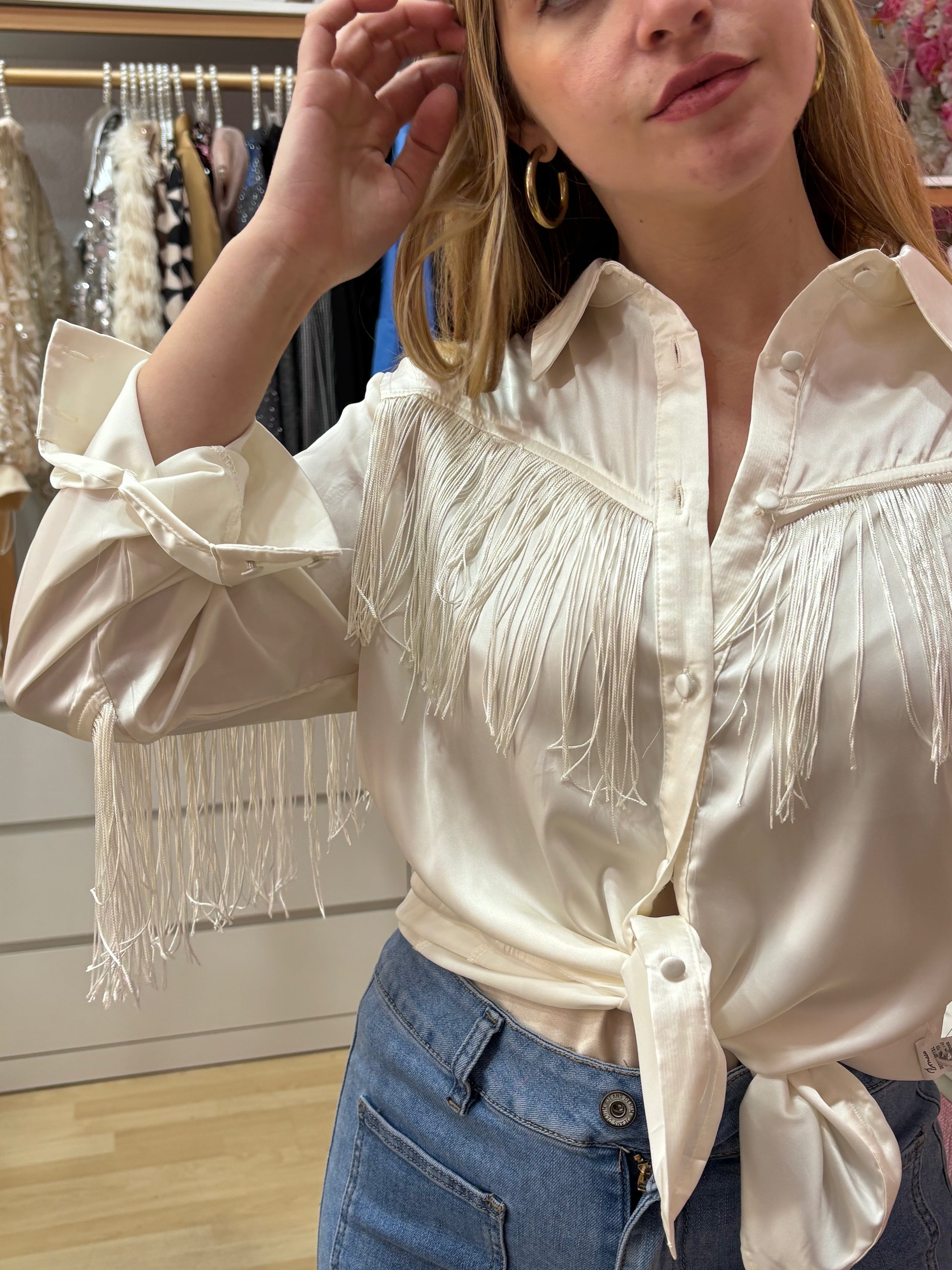 Camisa satinada de color beige adornada de flecos en el delantero y espalda.Talla única 36-42 aprox