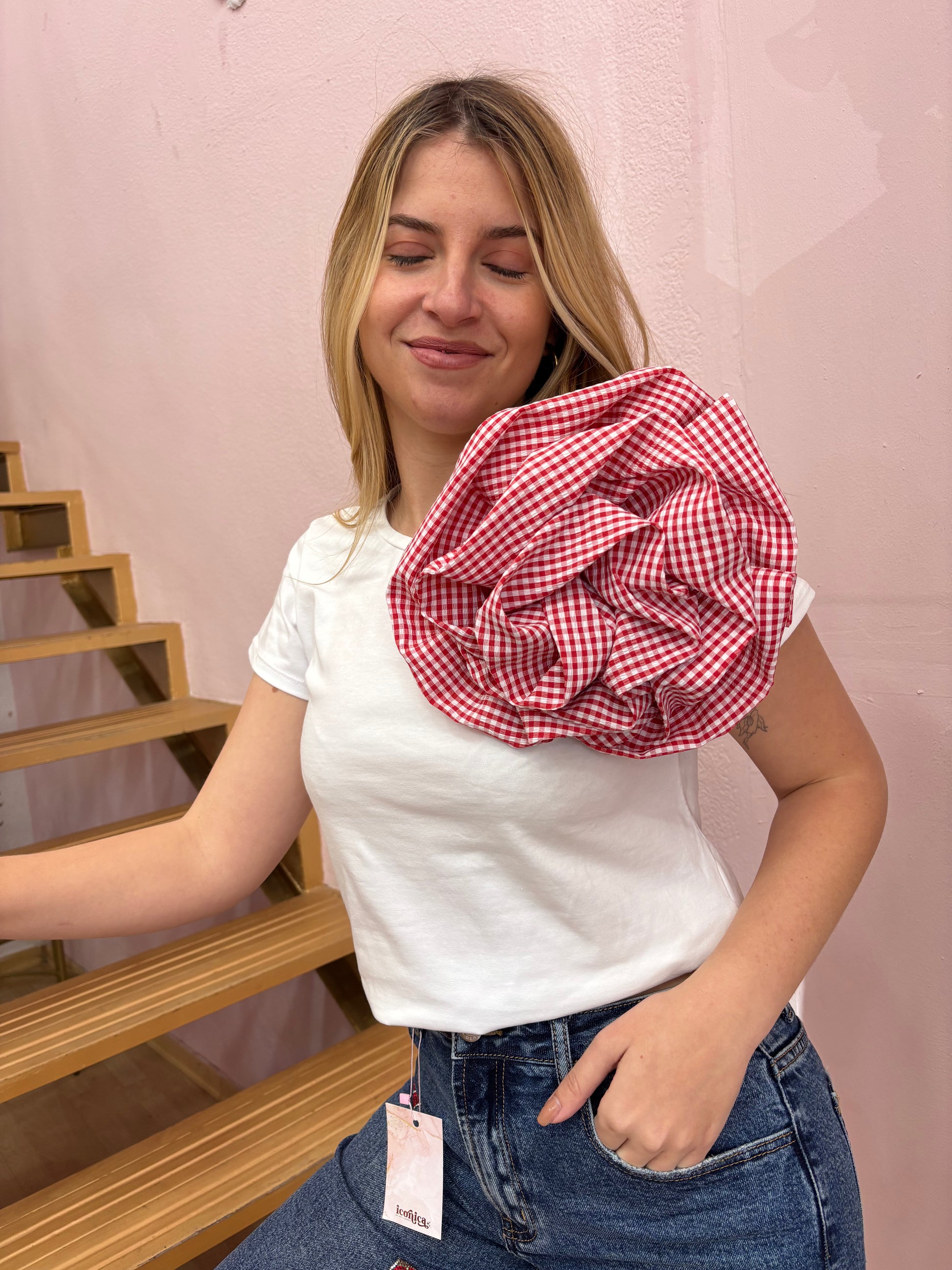 Camiseta blanca de algodón, con adorno de broche de flor en rojo vichy . ( flor desmostable)Talla única