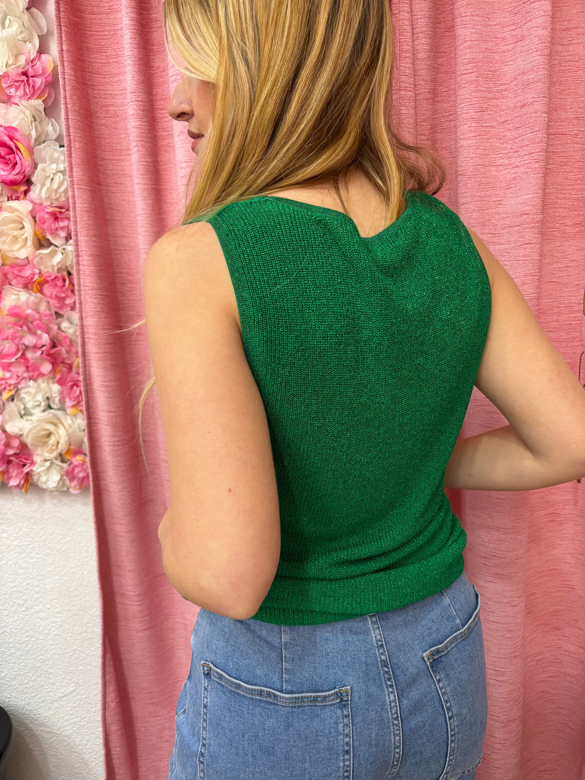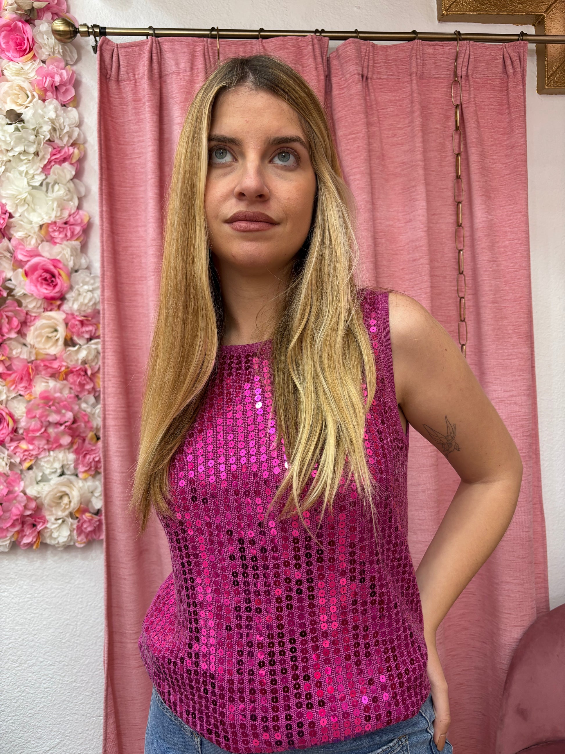 Camiseta de punto con lentejuelas en la parte delantera.Sin mangas y talla única en dos colores
