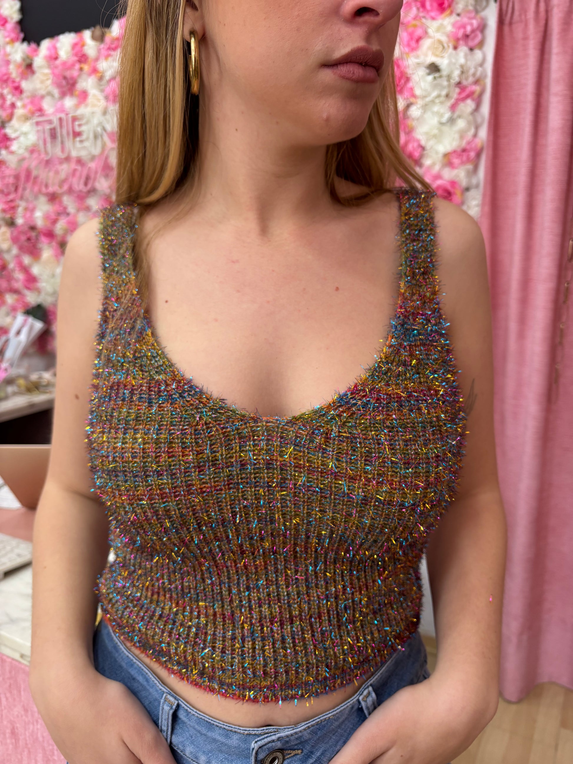 Camiseta de tirantes corta ,de punto ,con hilos de varios colores brillantes. Talla única .36-40 aprox