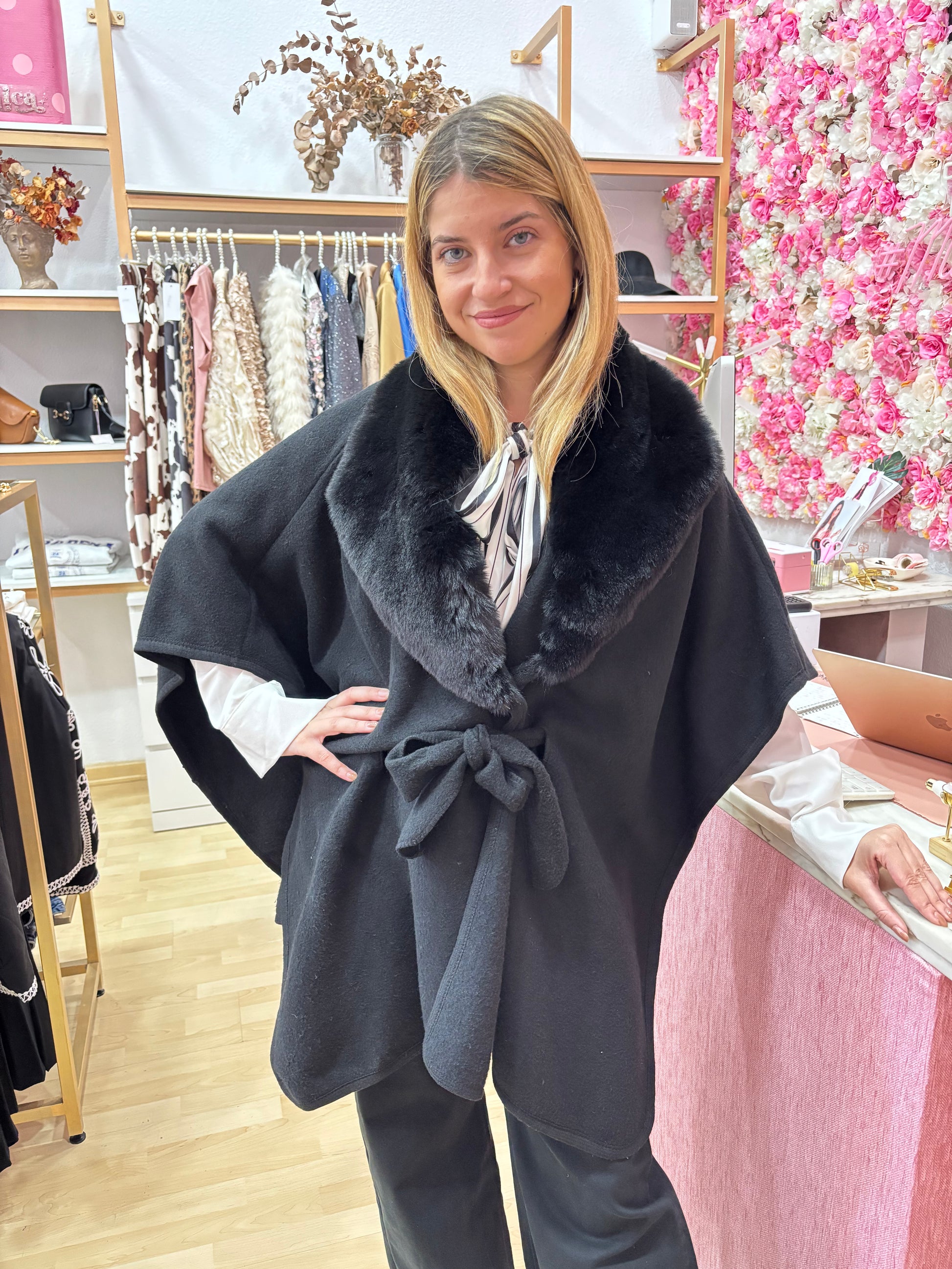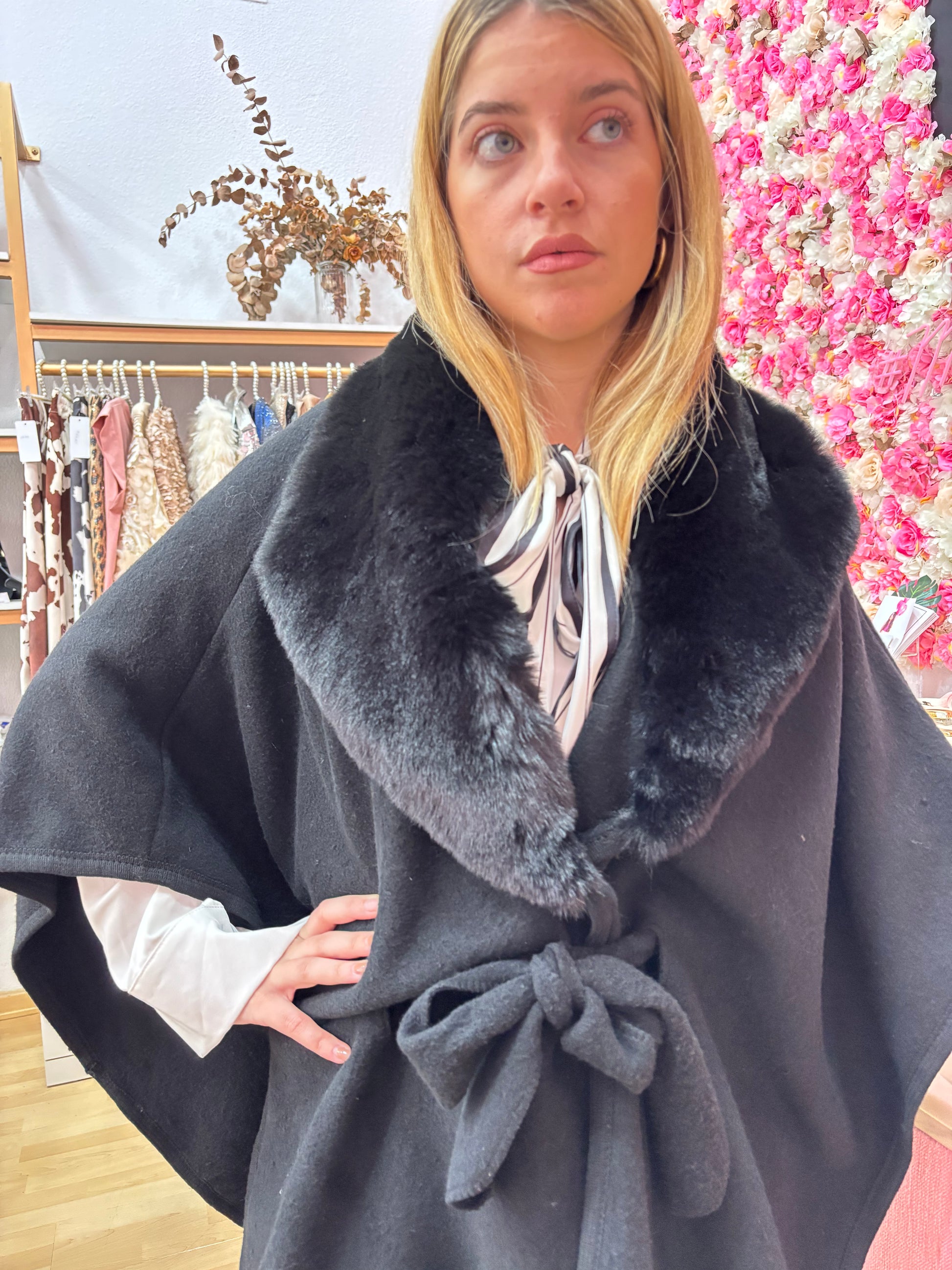 Capa de paño , color negro, con cuello de pelo .talla unica. Ceñida con un cinturón del mismo tejido