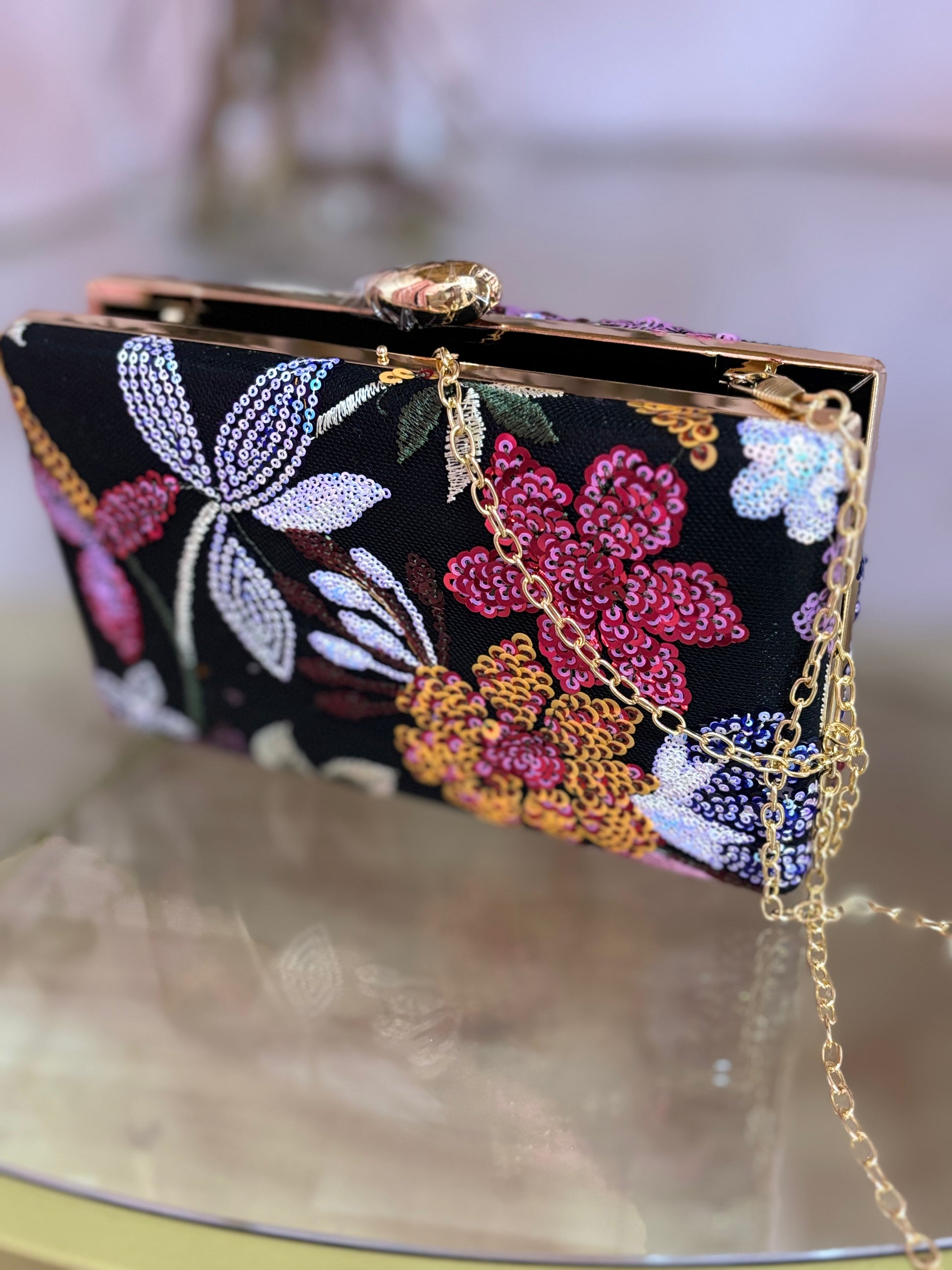 Cartera bordada de lentejuelas de diferentes colores haciendo flores., sobre fondo negro. Tiene cadena para que resulte mas cómodo.Cierre color dorado