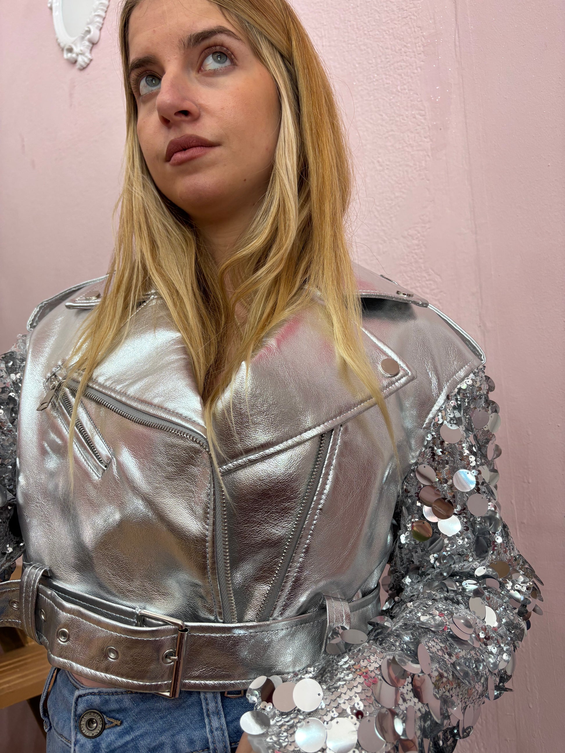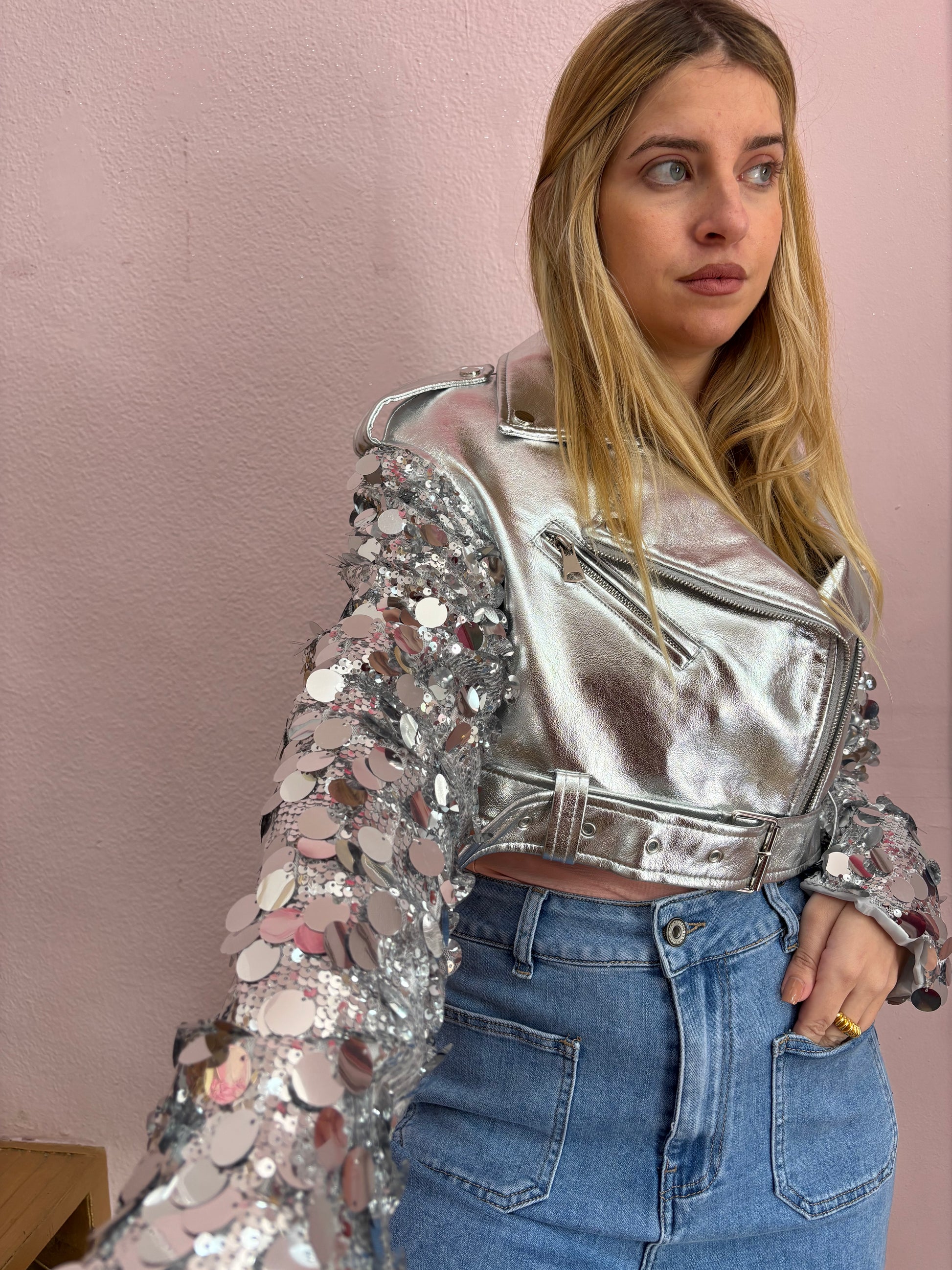 Cazadora corta perfecto , con adorno de lentejuelas ,todo de color plateado.