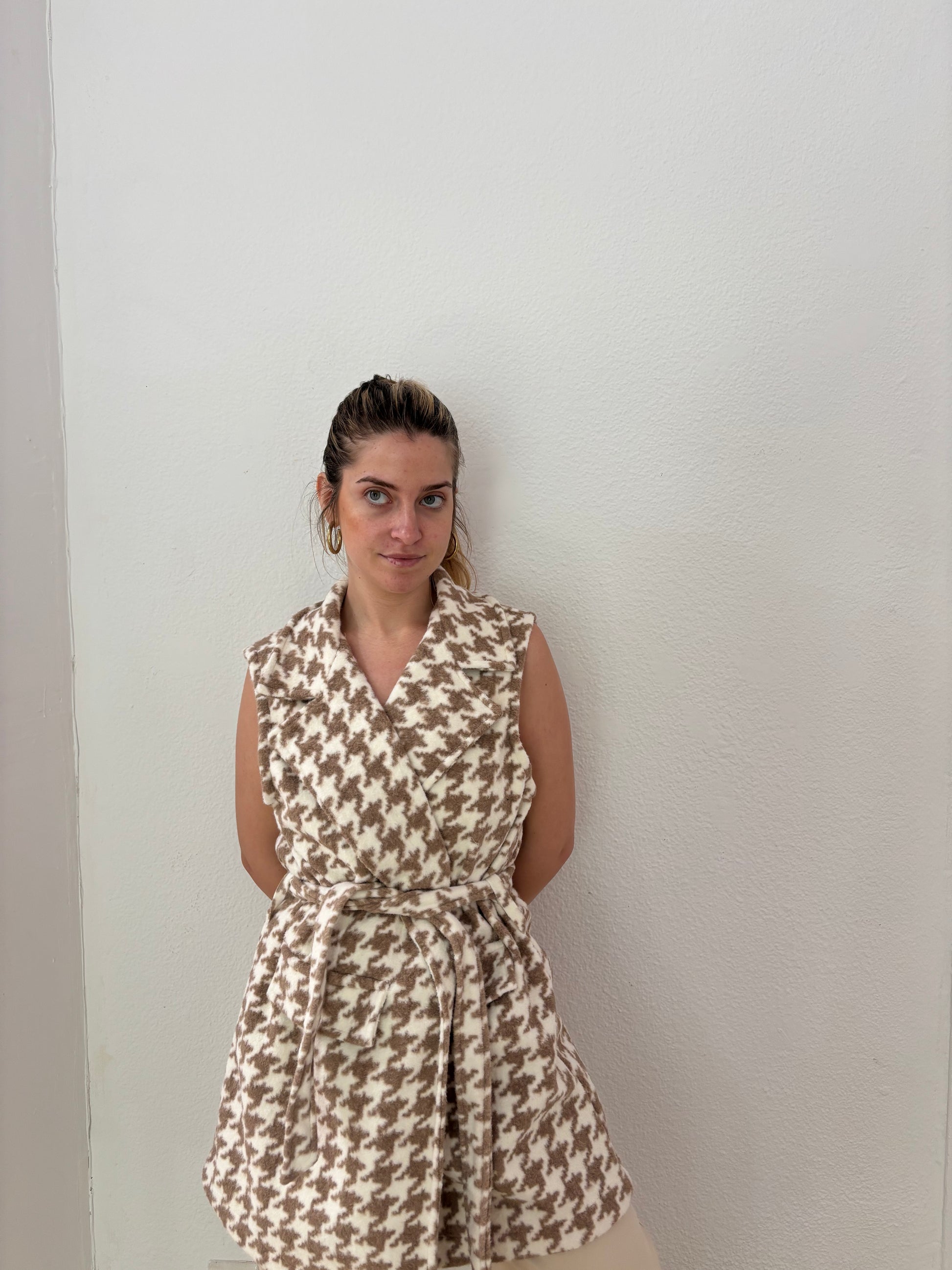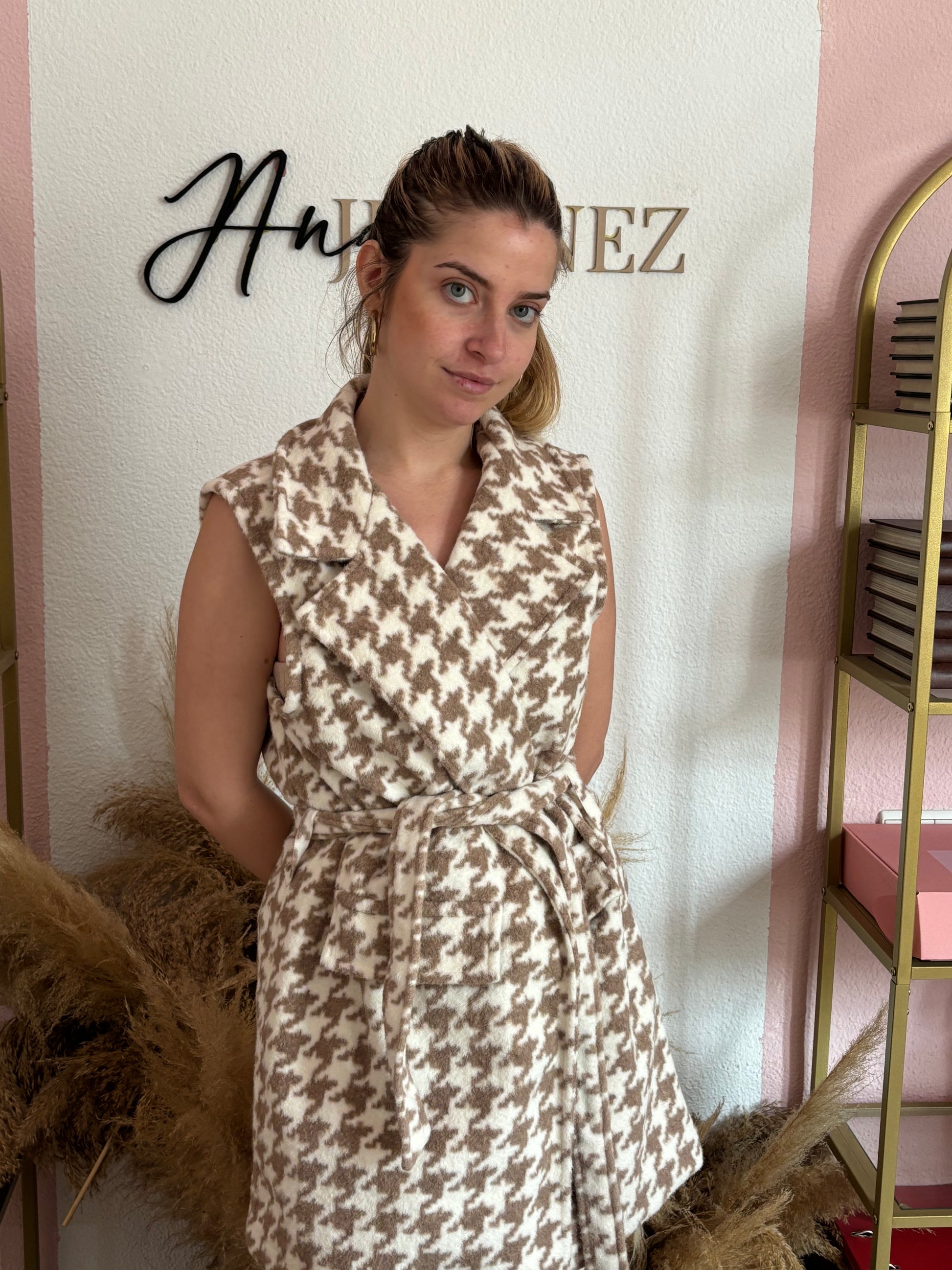 Chaleco vichy de color blanco y beige . Tejido de paño ,cruzado y anudado con un cinturón .Talla única 36-44 aprox.