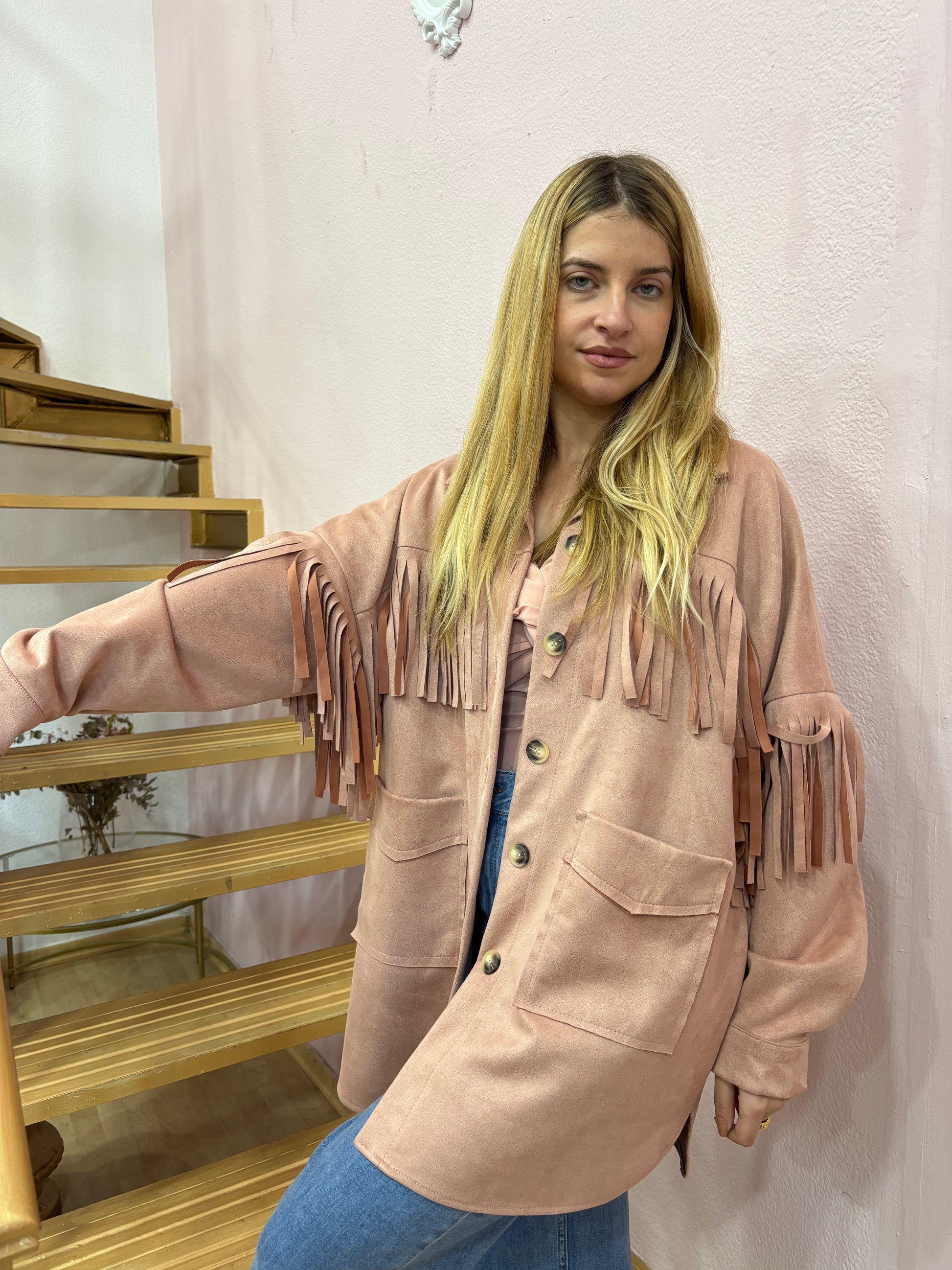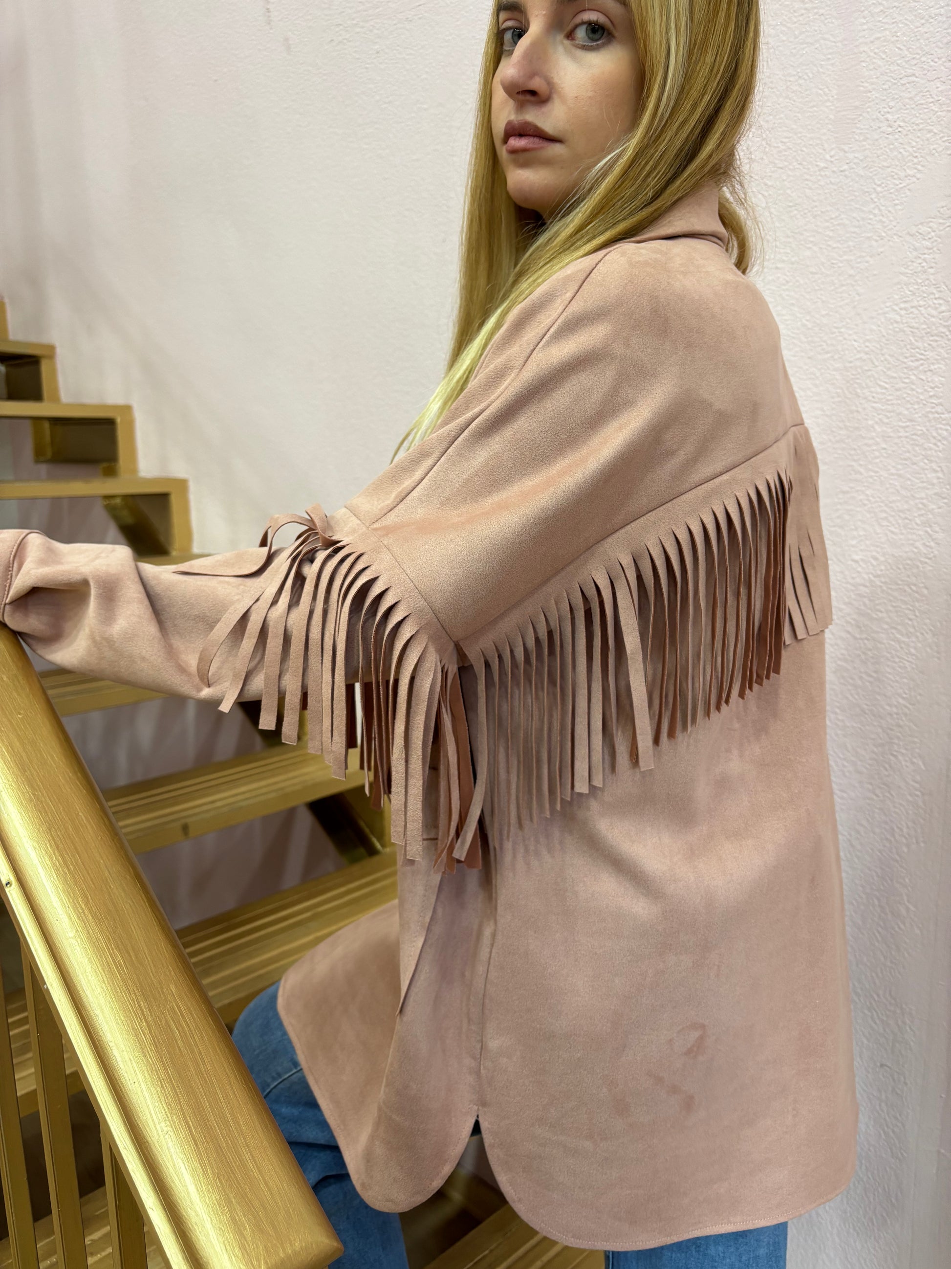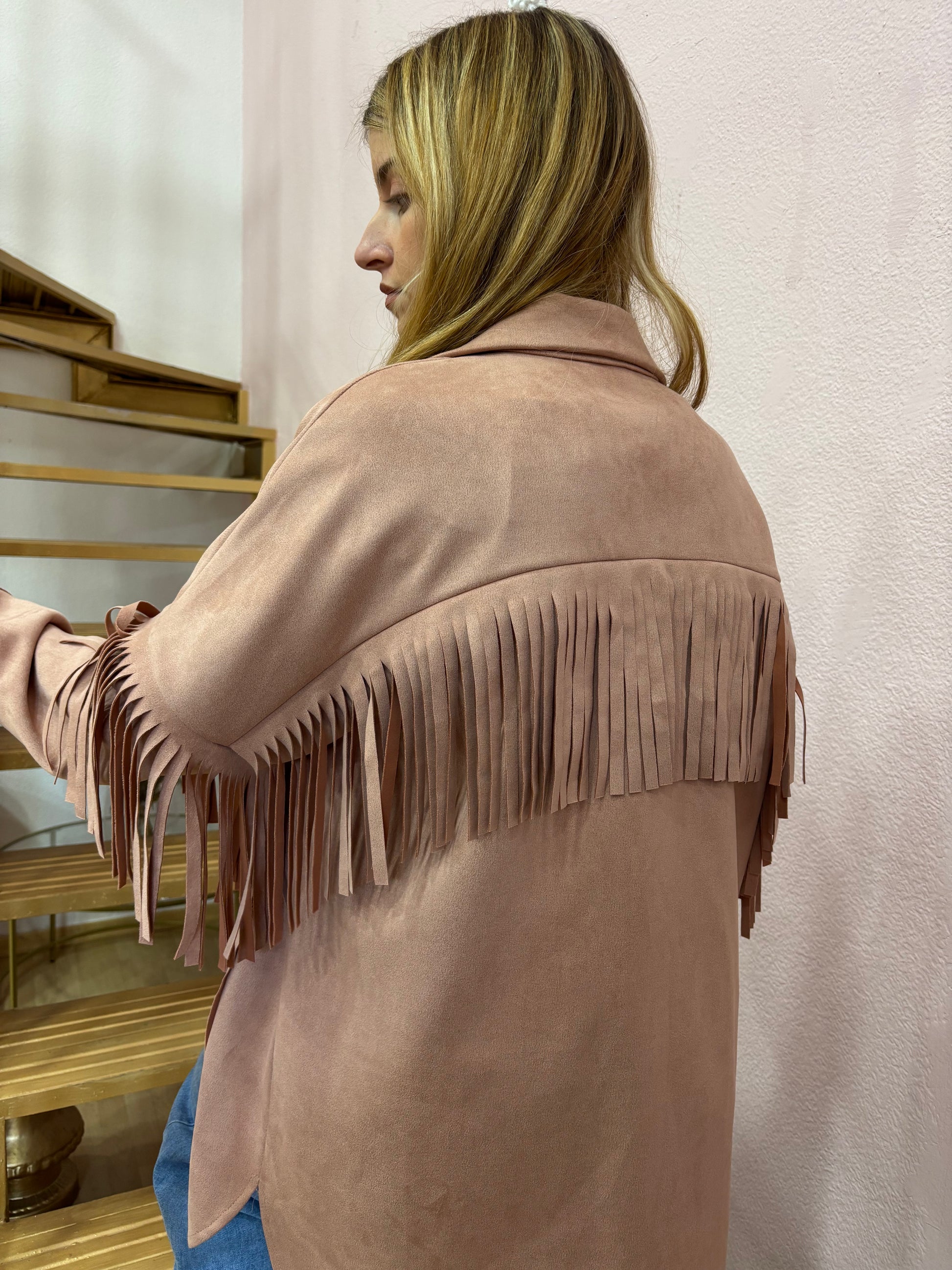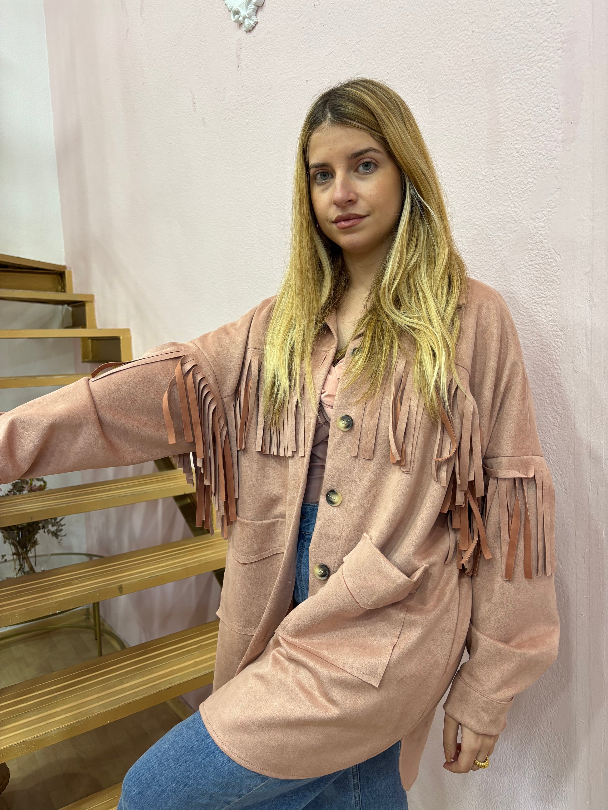 Chaqueta 3/4 oversize ,de antelina en color rosa empolvado con un acabado de flecos hecho del mismo tejido . Con bolsillo amplios en el delantero. Talla única