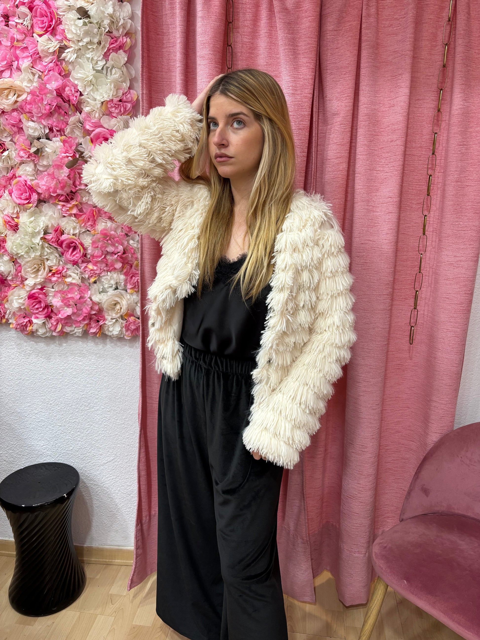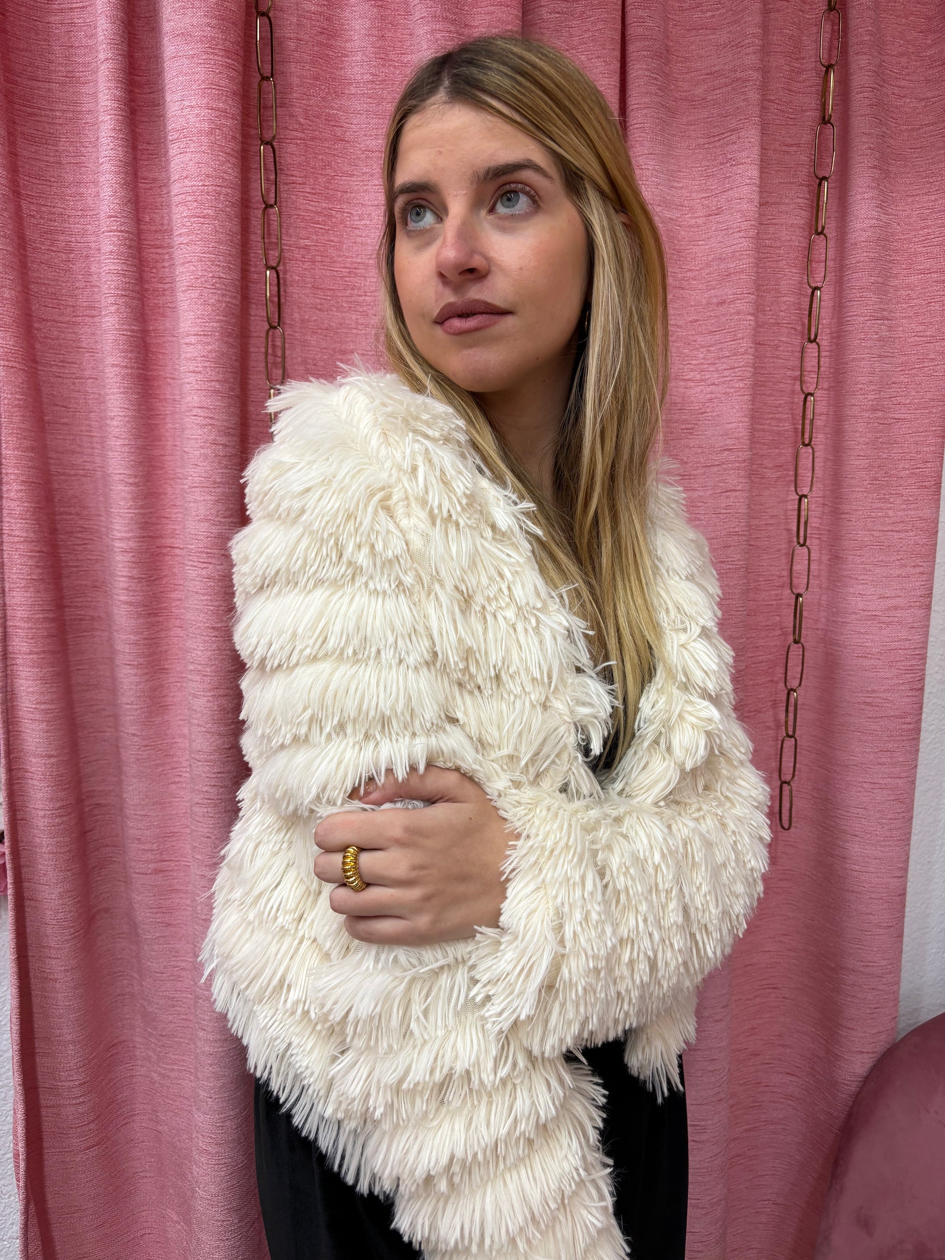 Chaqueta corta de color beige en tejido de poliester que compone unos flecos por toda la chaqueta.Manga larga .Cuello en V