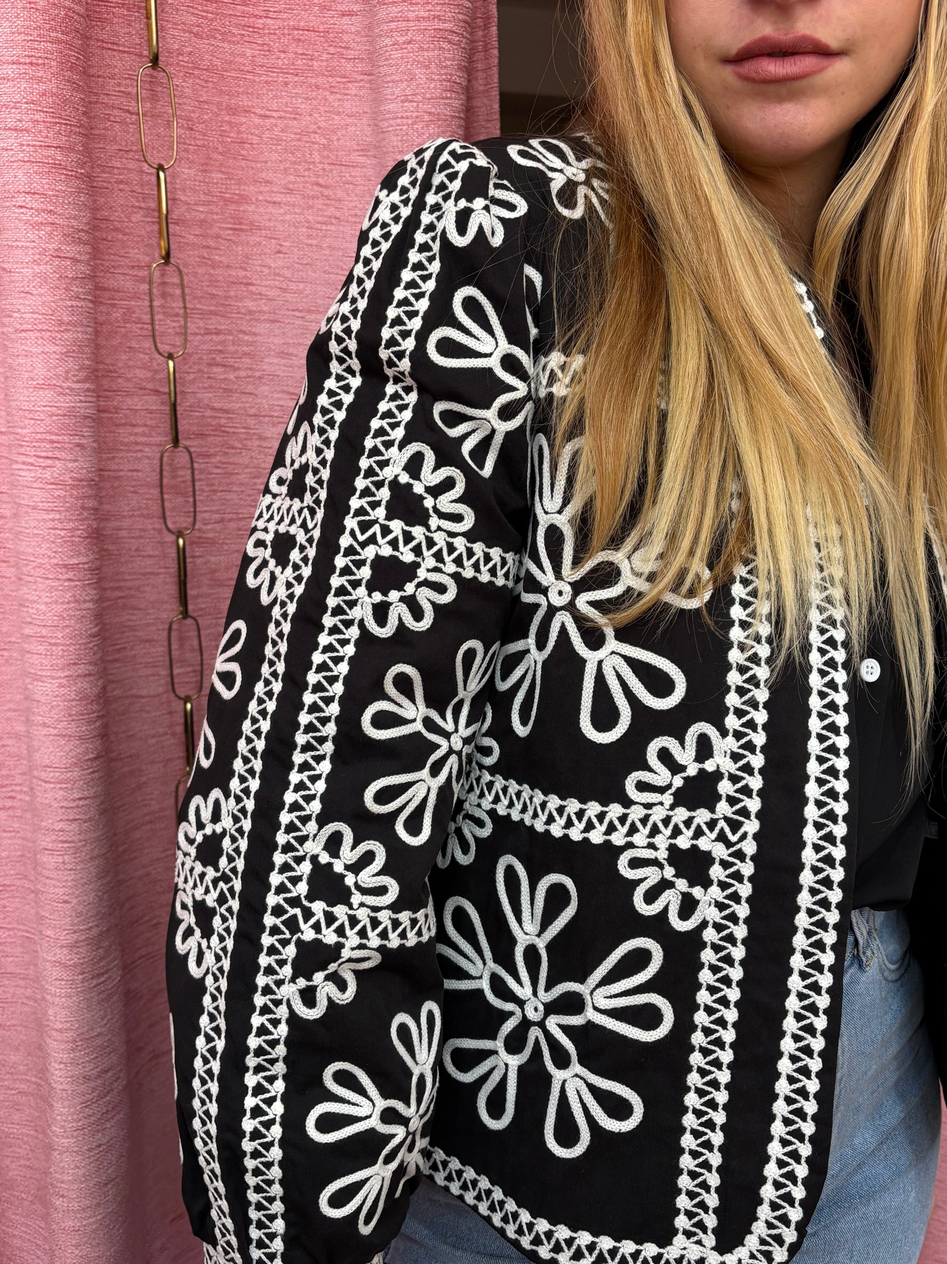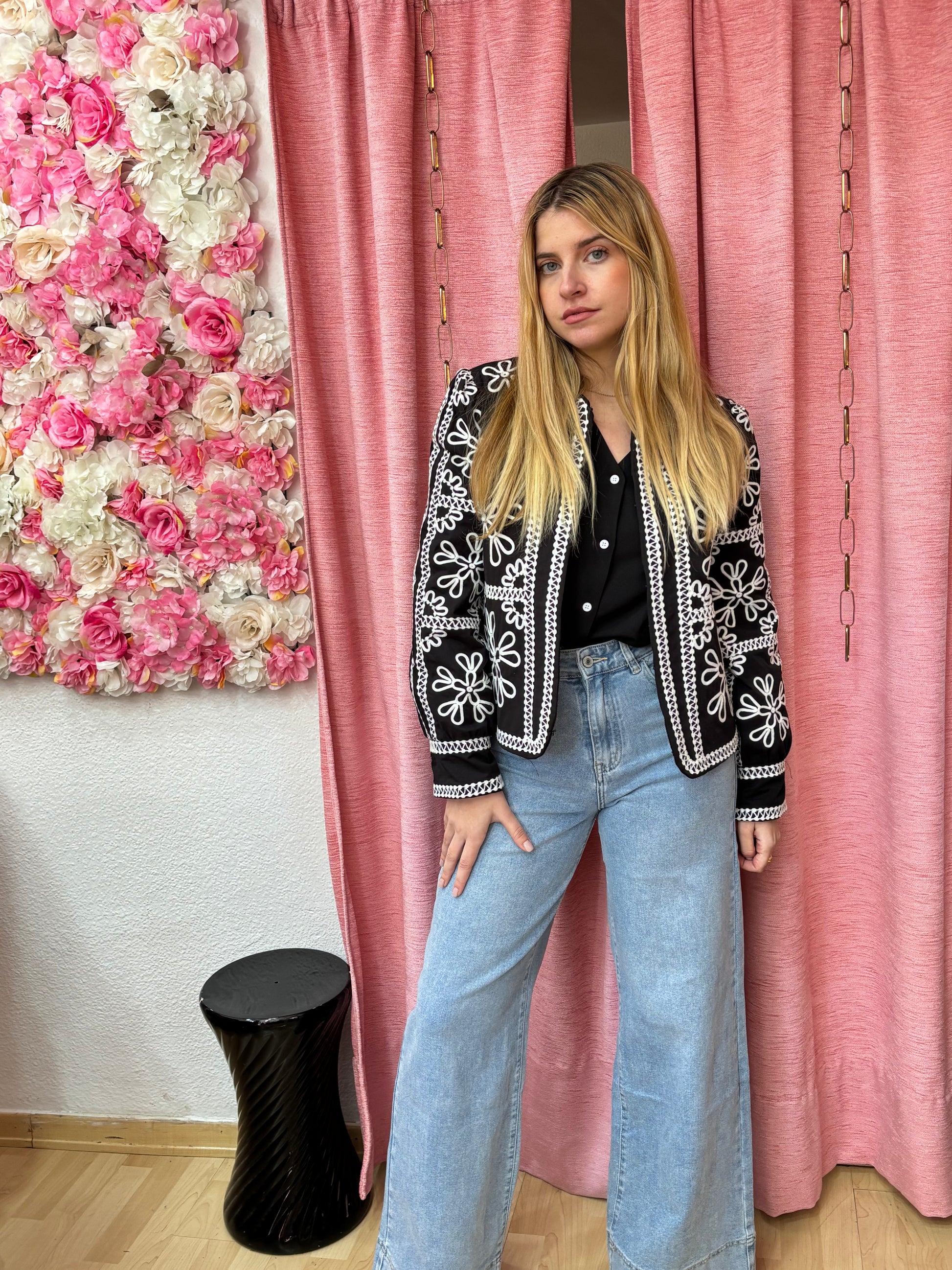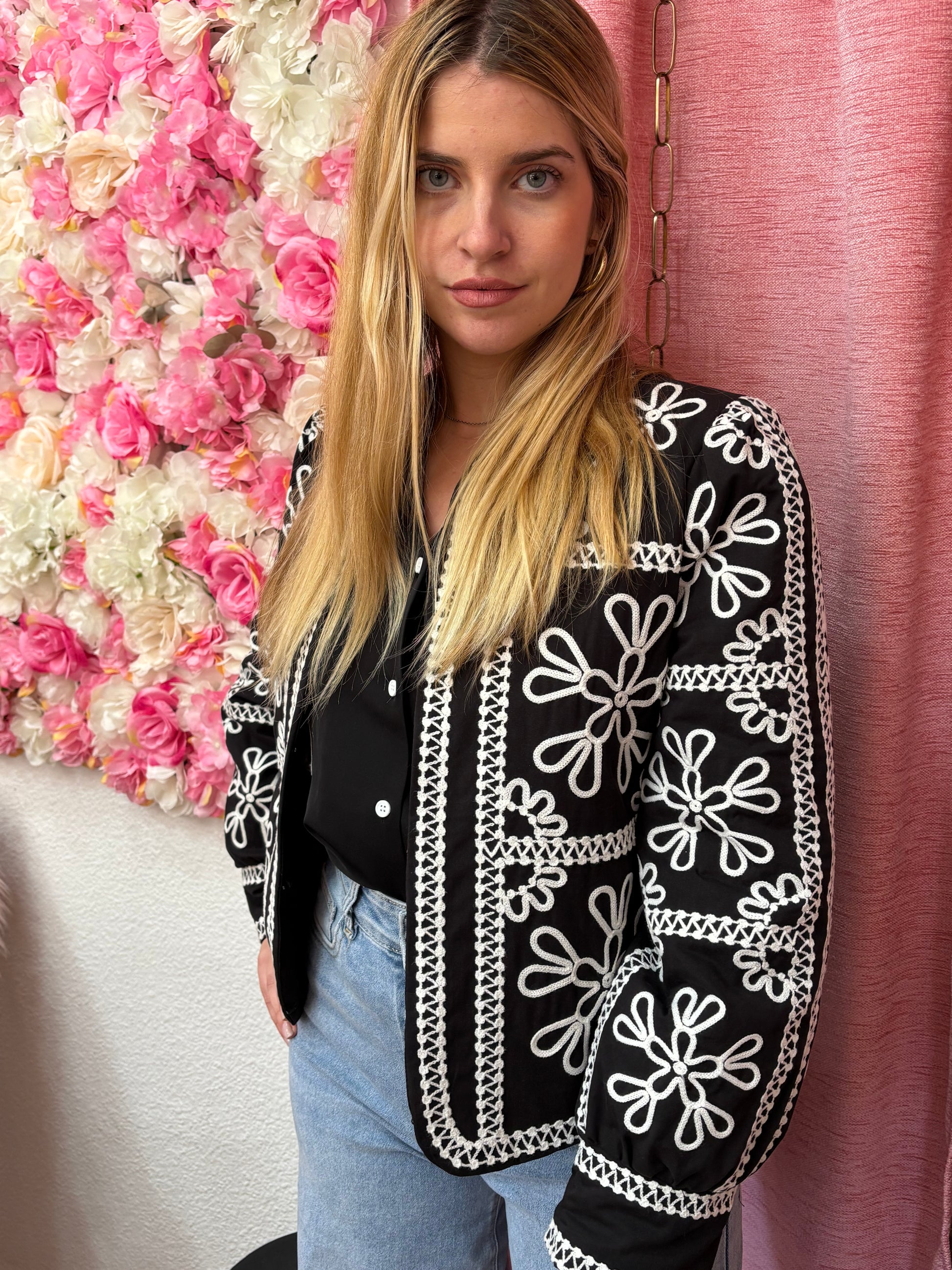 Chaqueta con adornos de flores y ribeteado con cinta blanca .Ligeramente enguatada. largo de la chaqueta por debajo de la cintura. Color negro de fondo con dibujo en blanco. Abrochado con corchetes