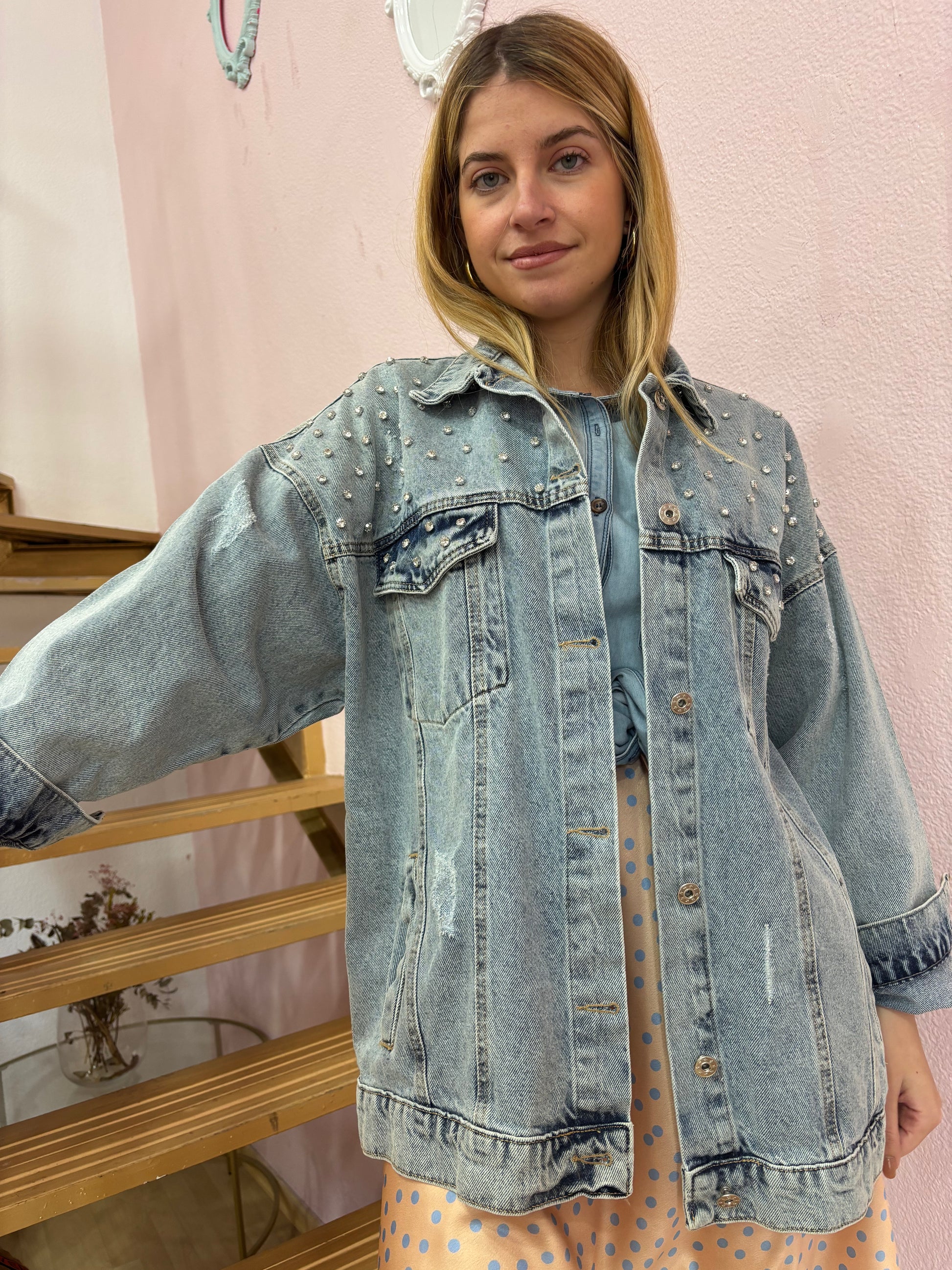 Chaqueta vaquera oversize de talle largo , con bolsillos laterales y decorada con brillates en la parte superior del delantero. Bolsillos en el pecho y en la parte inferior de la chaqueta.100% algodón