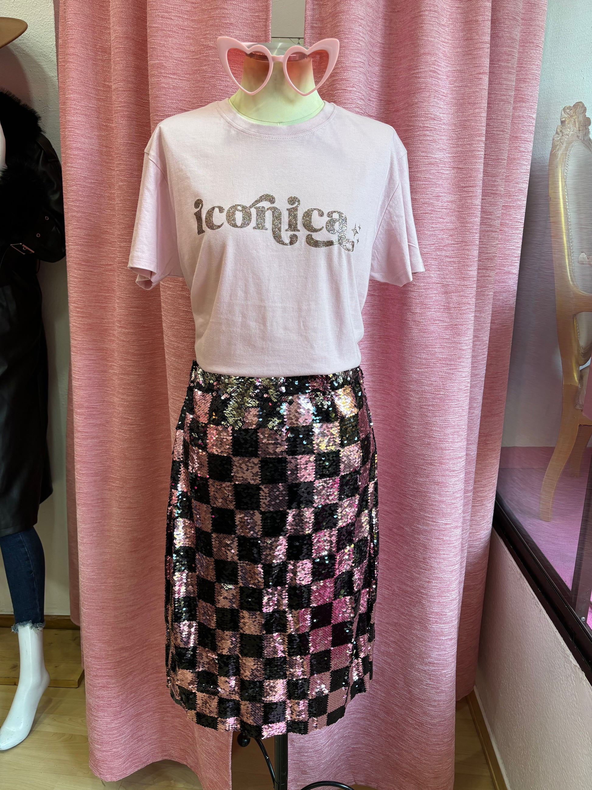 Falda corta de lentejuelas con estampado de damero en dos colores , negro y rosa.Cintura elástica . Talla única.