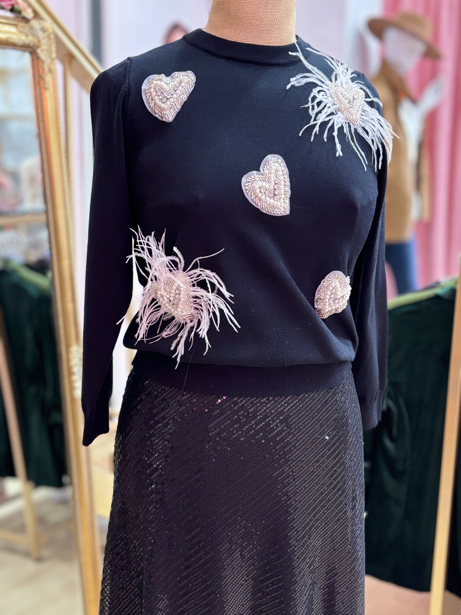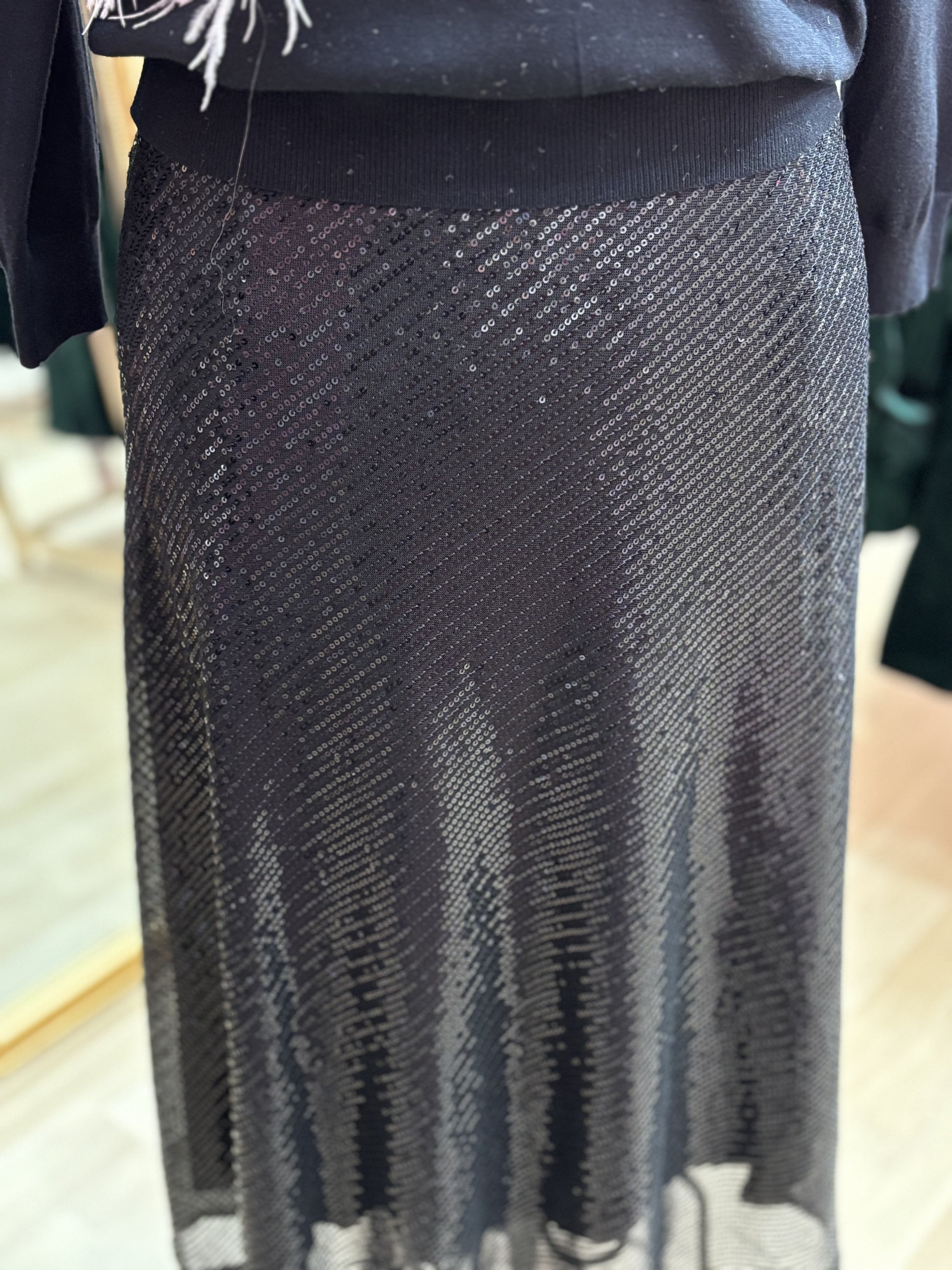 Falda de lentejuelas negra ,con forma evasé , cintura elástica .Con forro .Talla única 36-42 aprox