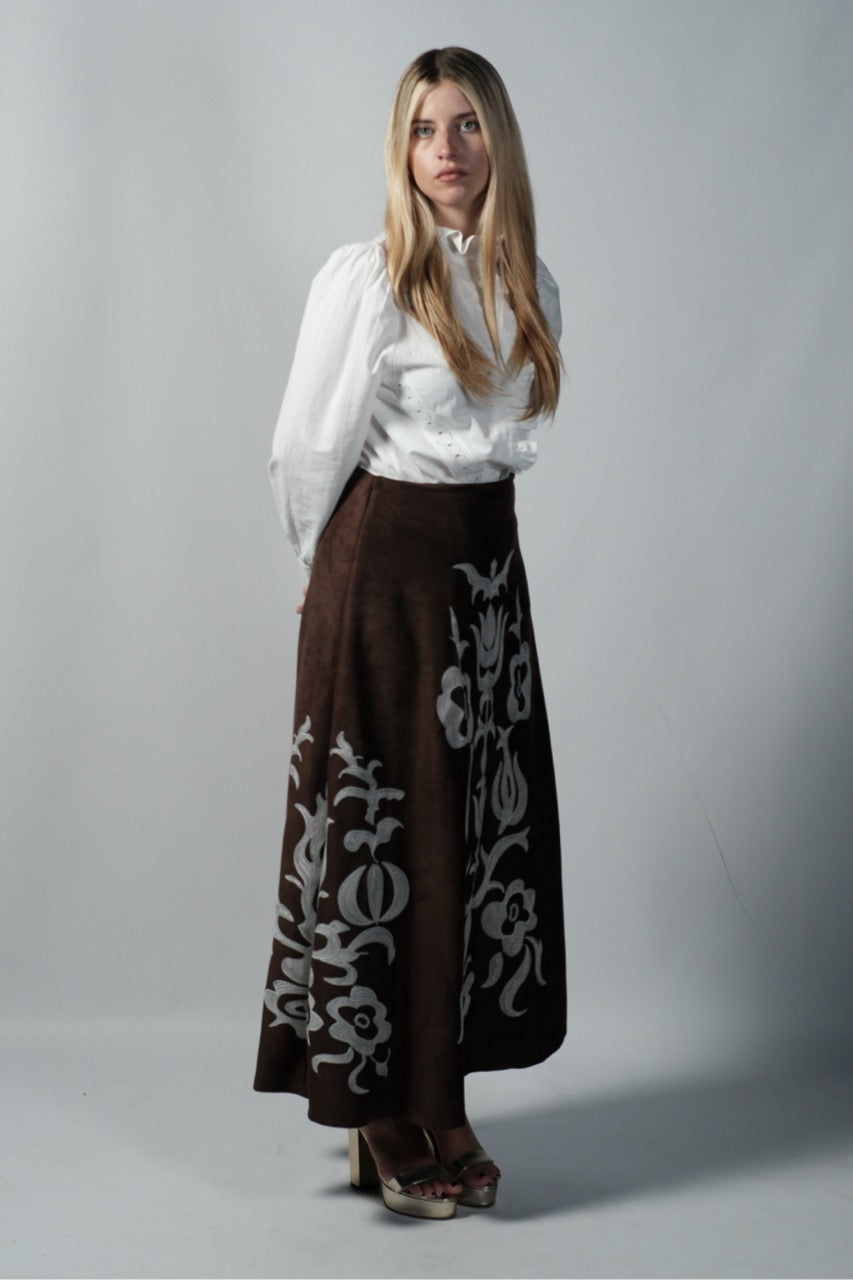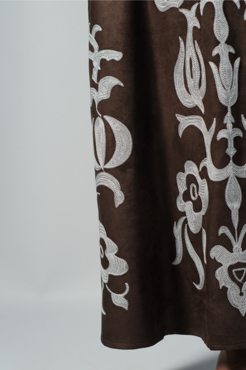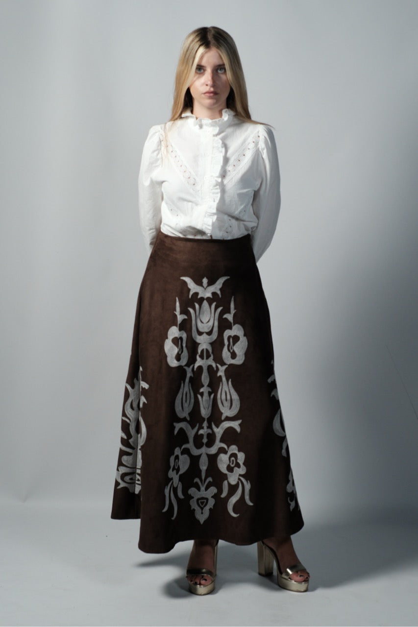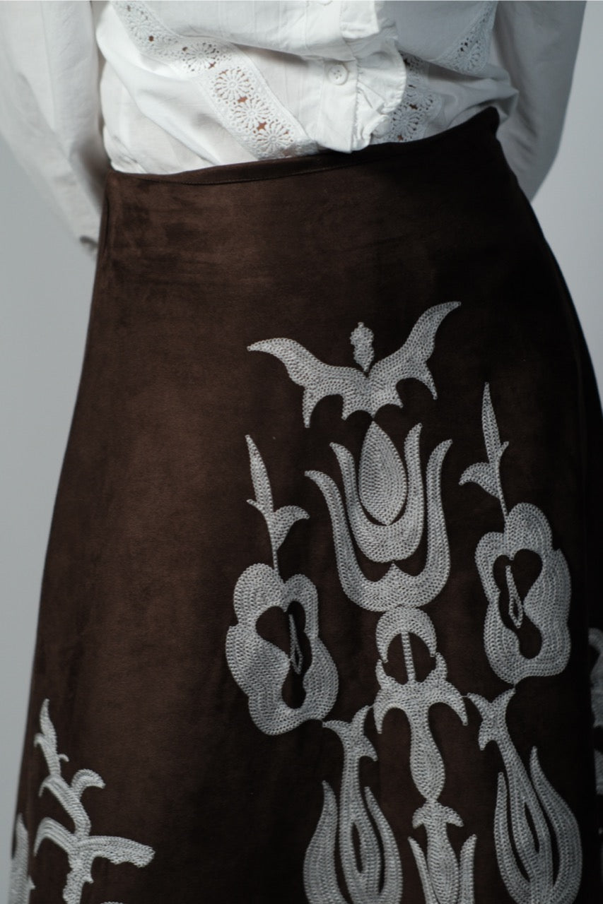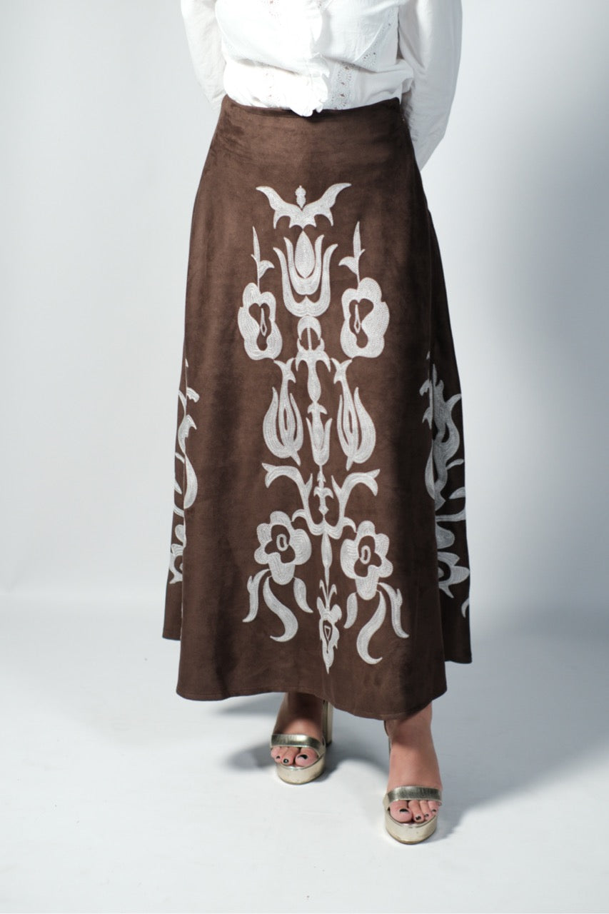 Falda de capa ,tejida en antelina , de color marrón chocolate y con grandes bordados en color blanco roto.Talla S,M y L