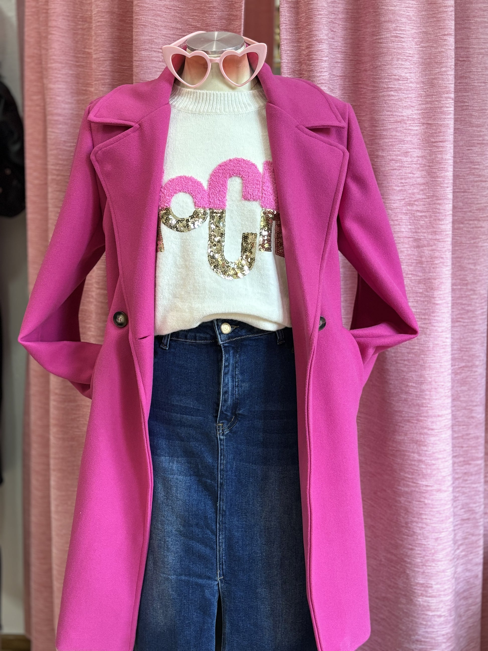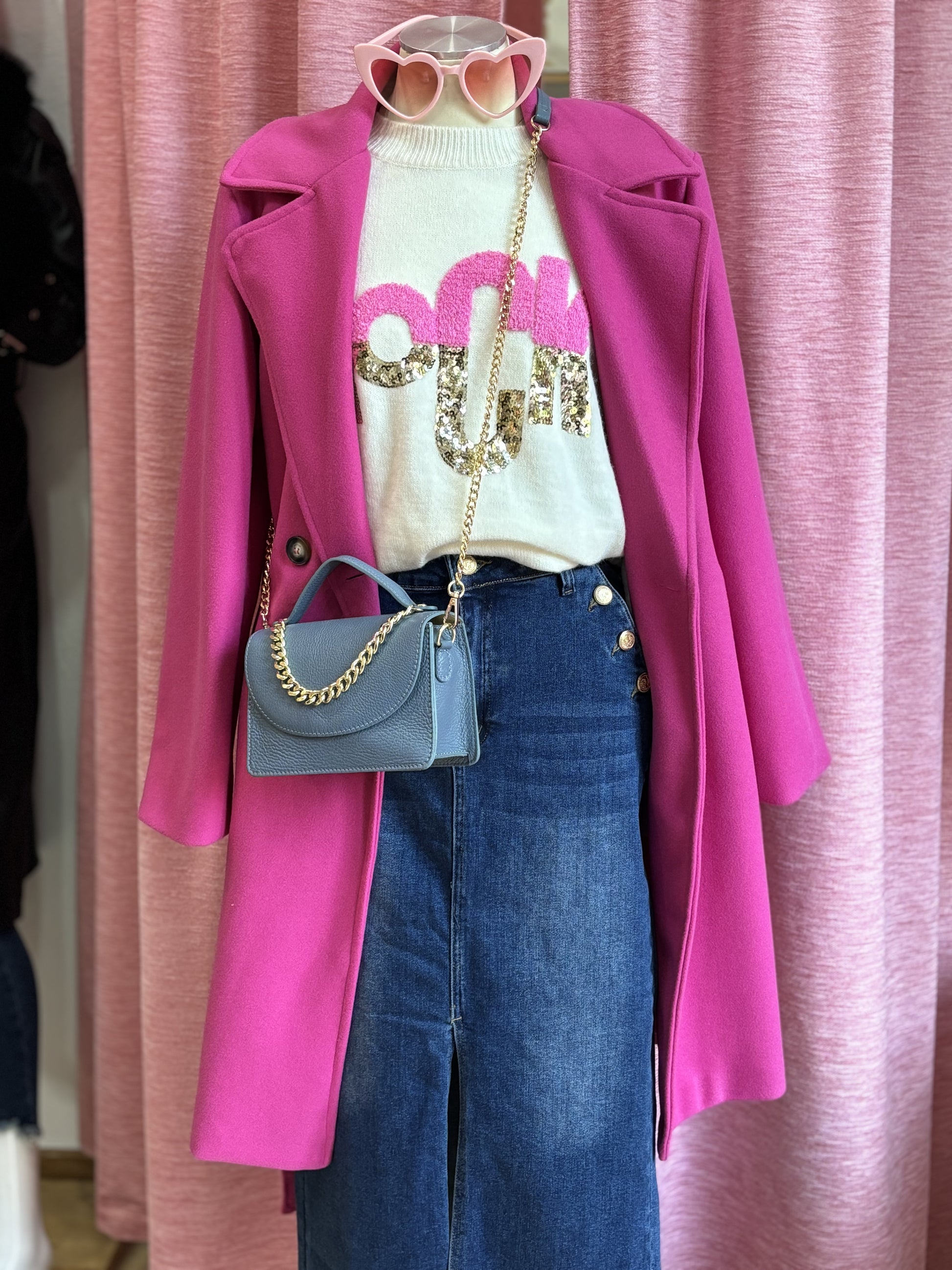 Falda vaquera con botones dorados .Tiene 4 bolsillos ,dos traseros y dos delanteros adornados con botones dorados. Abertura delantera . Largo midi