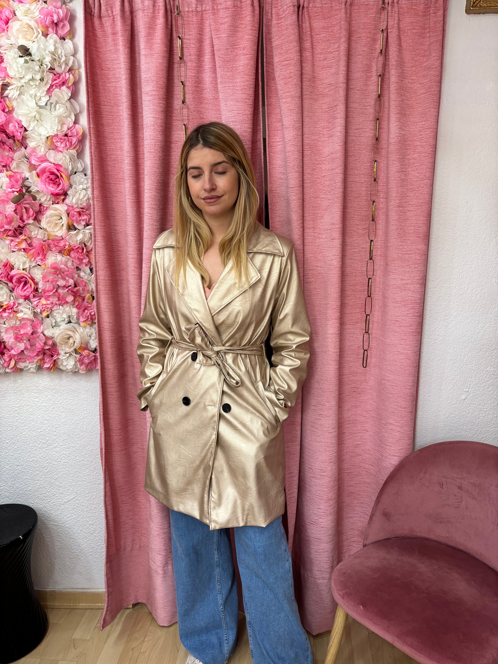 Gabardina clásica ligera , en cuero sintético, cruzada y anudada con un cinturón. Color dorado.Talla única 38-44 aprox