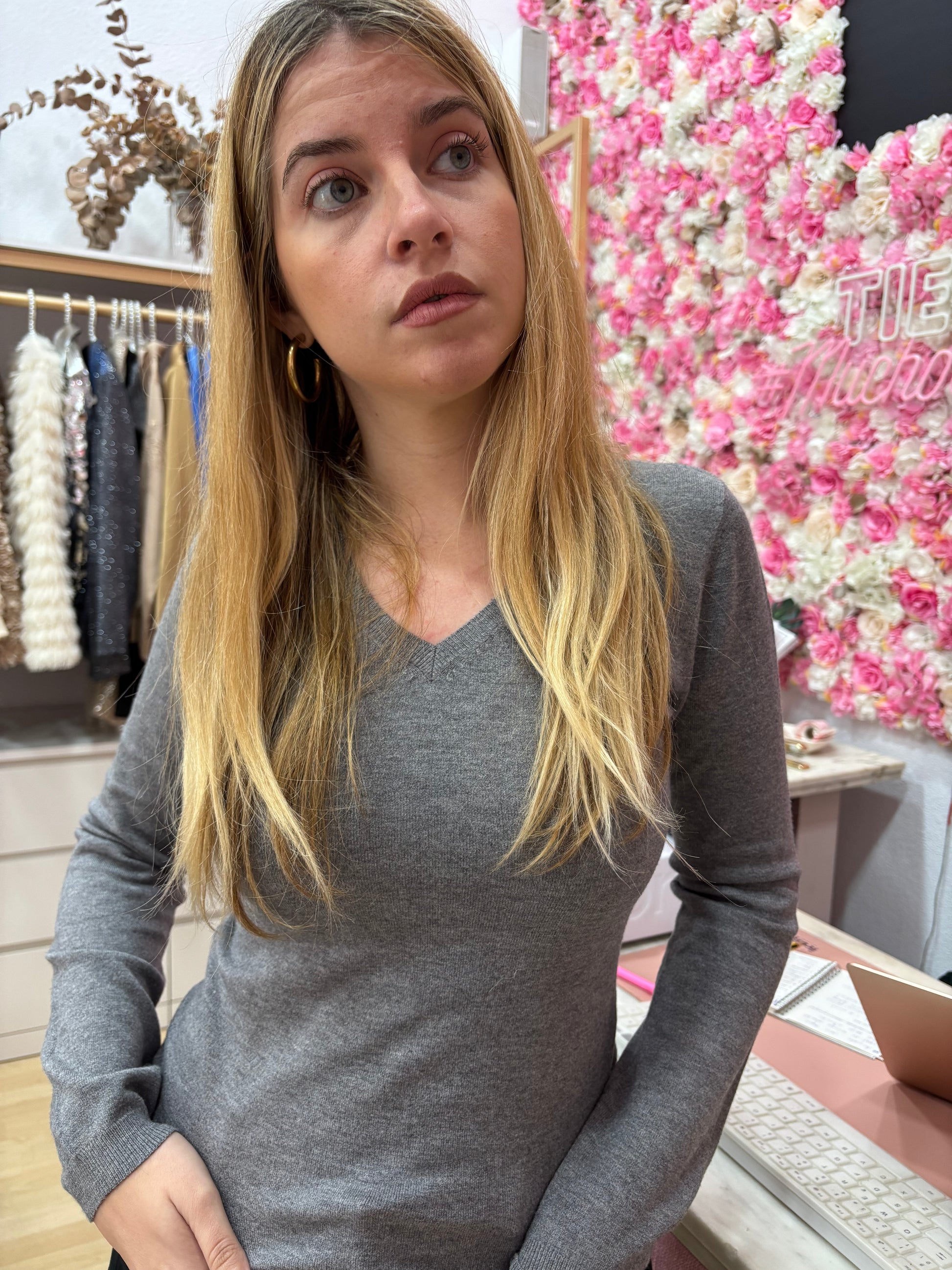 Jersey de punto fino ,son ajustados al cuerpo . Con cuello en pico .en dos colores gris y color topo