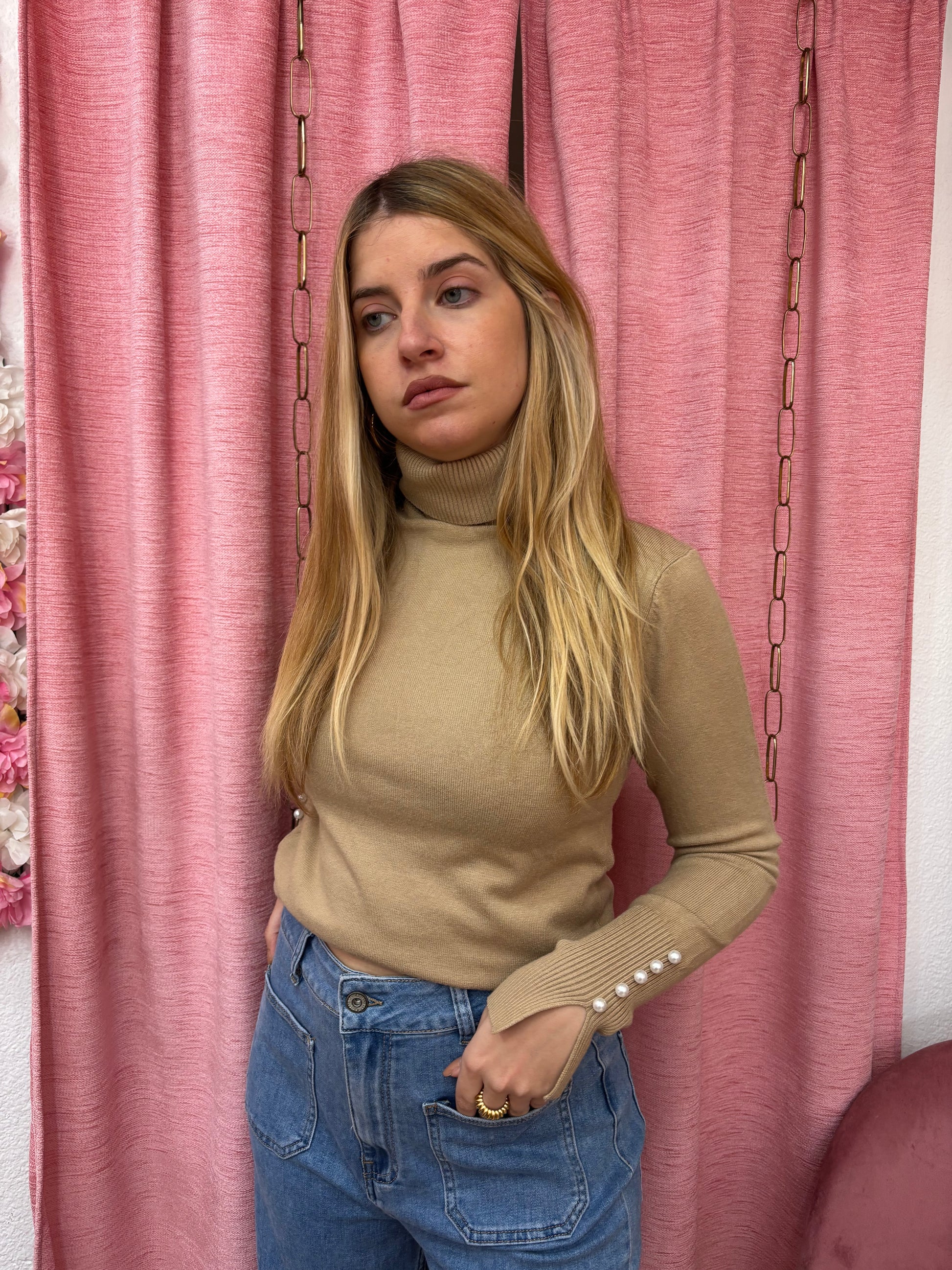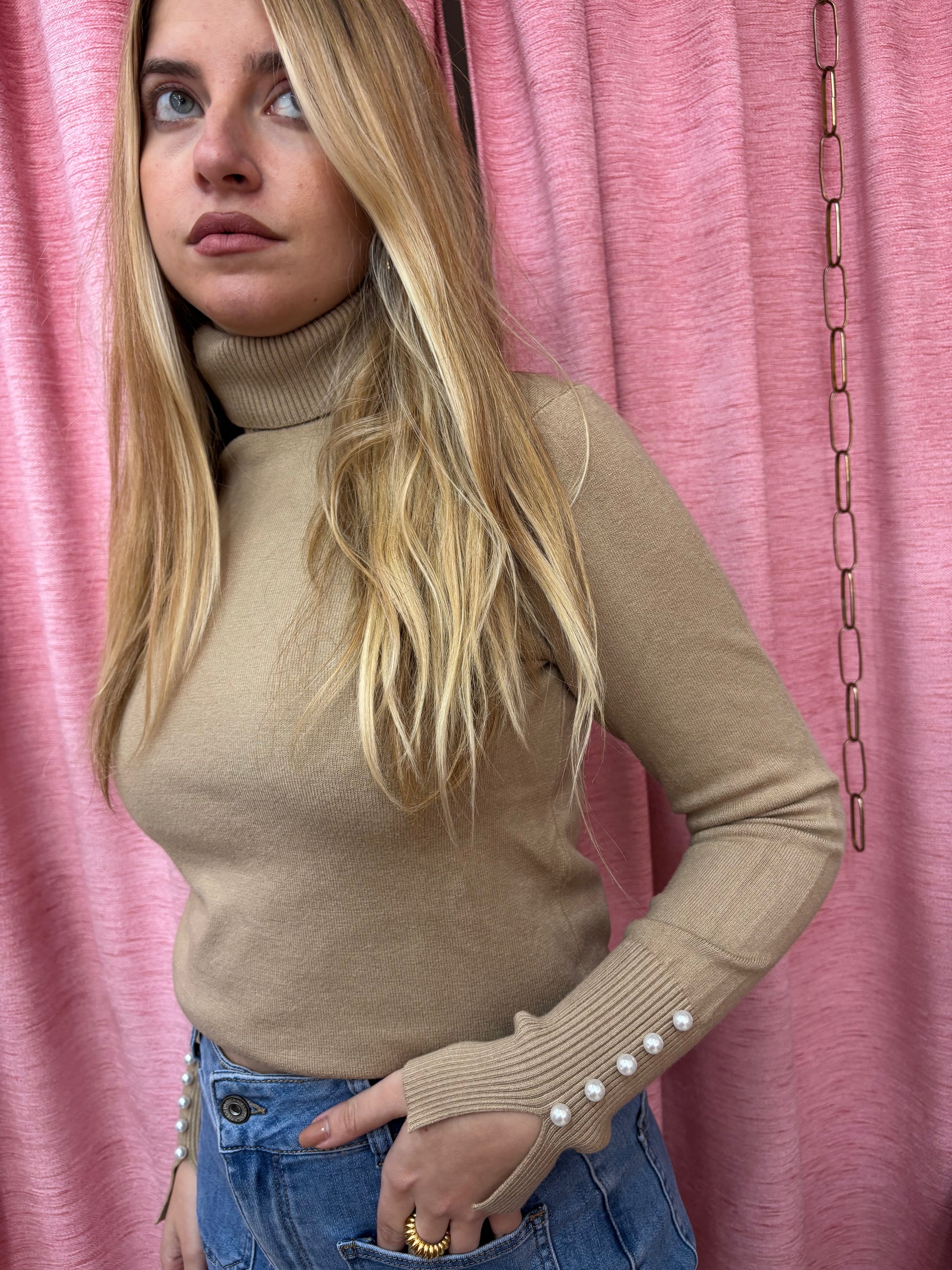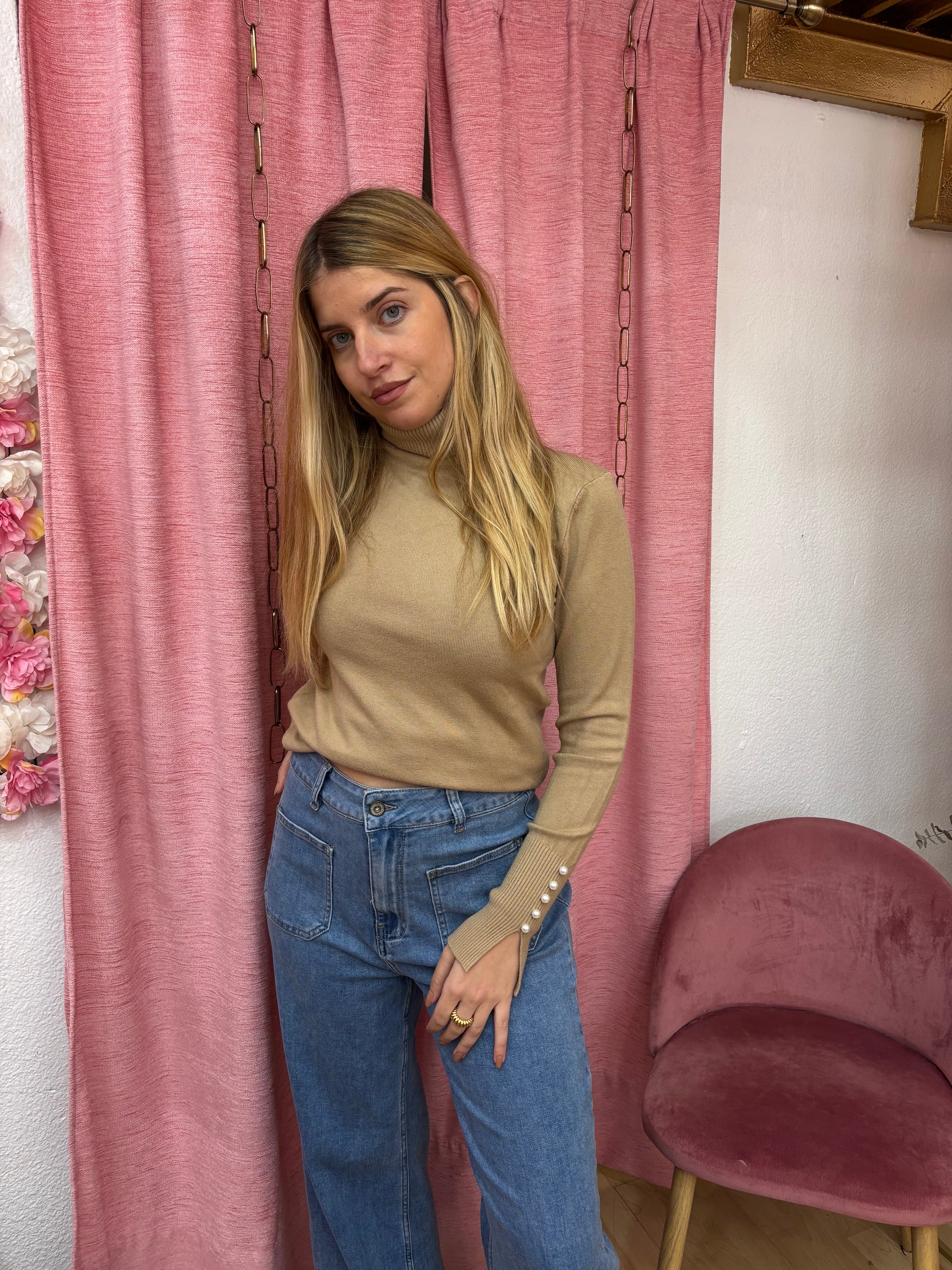 Jersey de cuello cisne en color camel. Perlas en los puños .Talla única 36-42 aprox