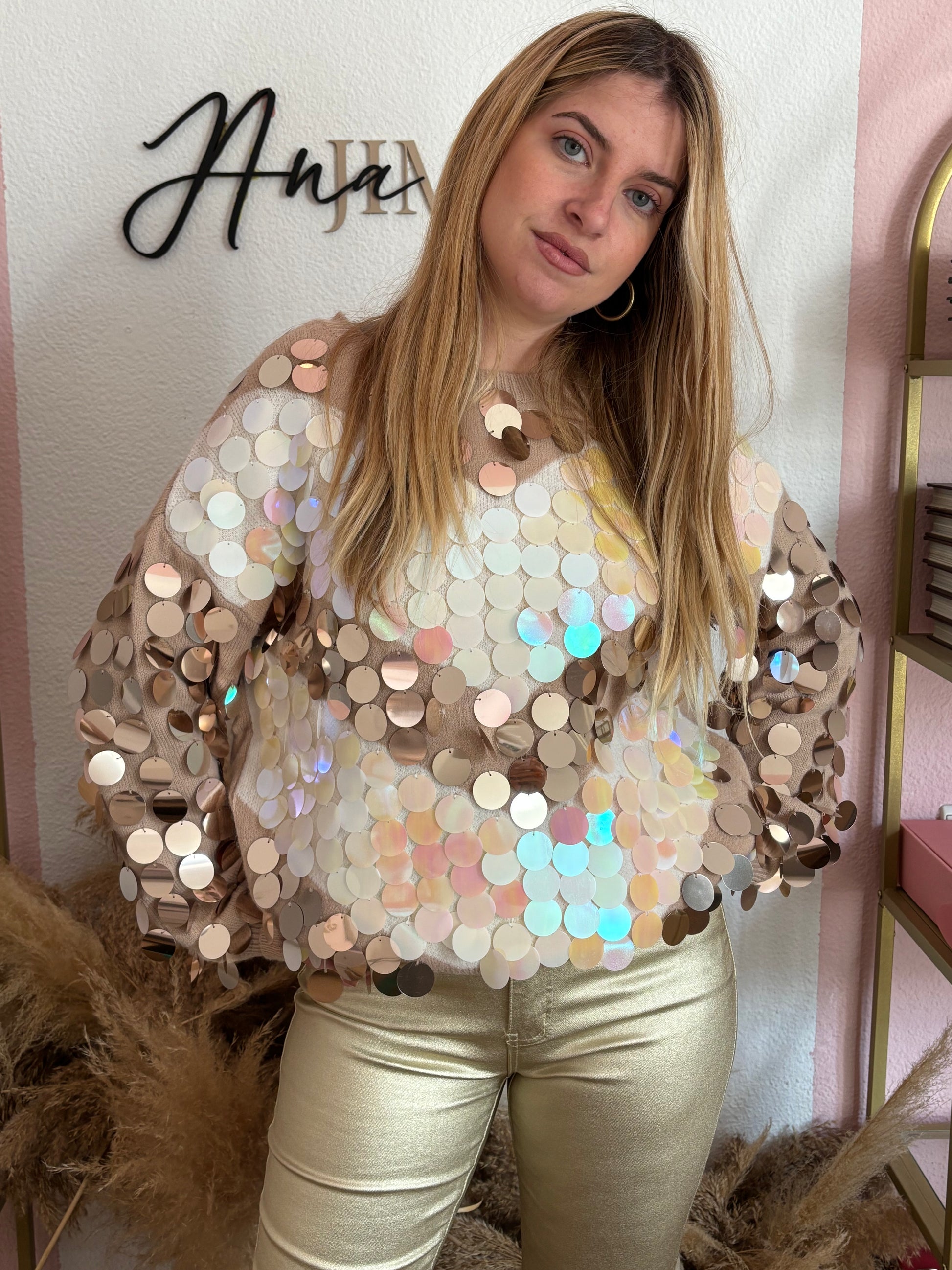 Jersey de color beige con lentejuelas de distintos colores .Talla única. La espalda no lleva lentejuelas