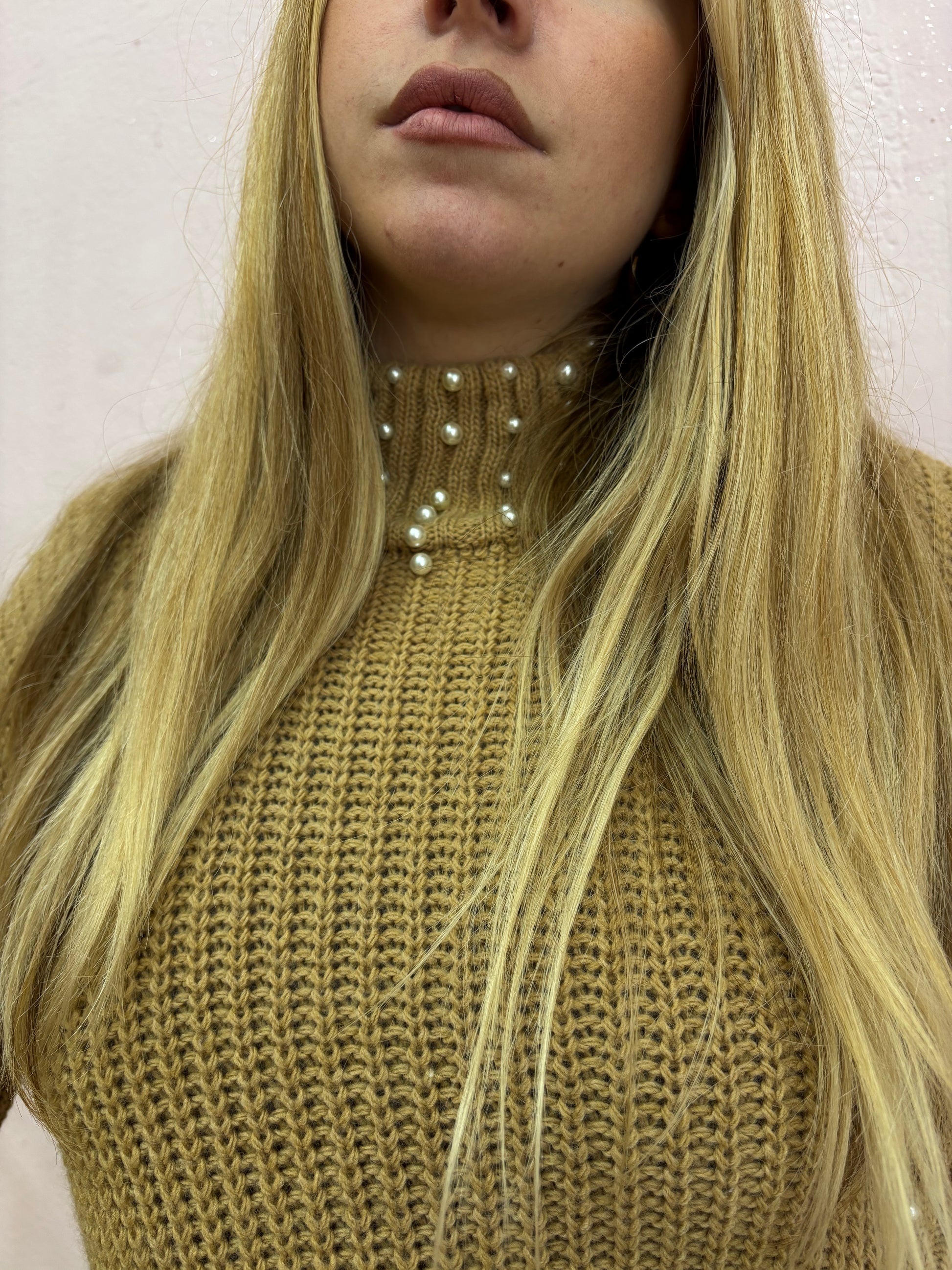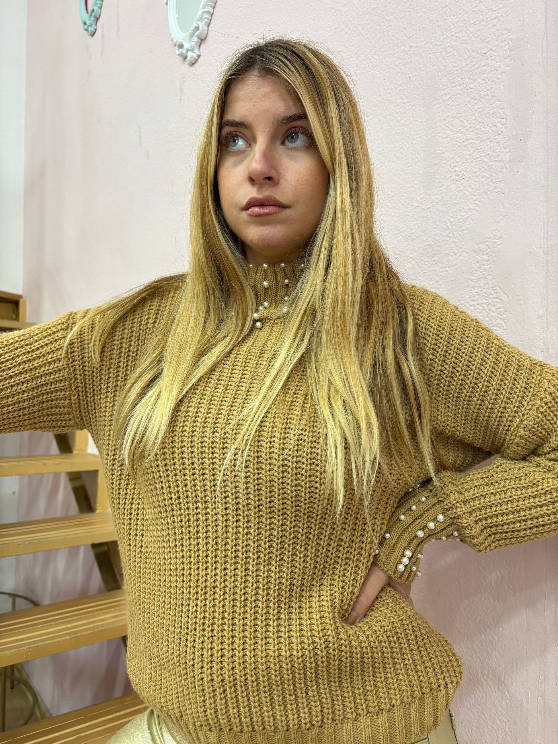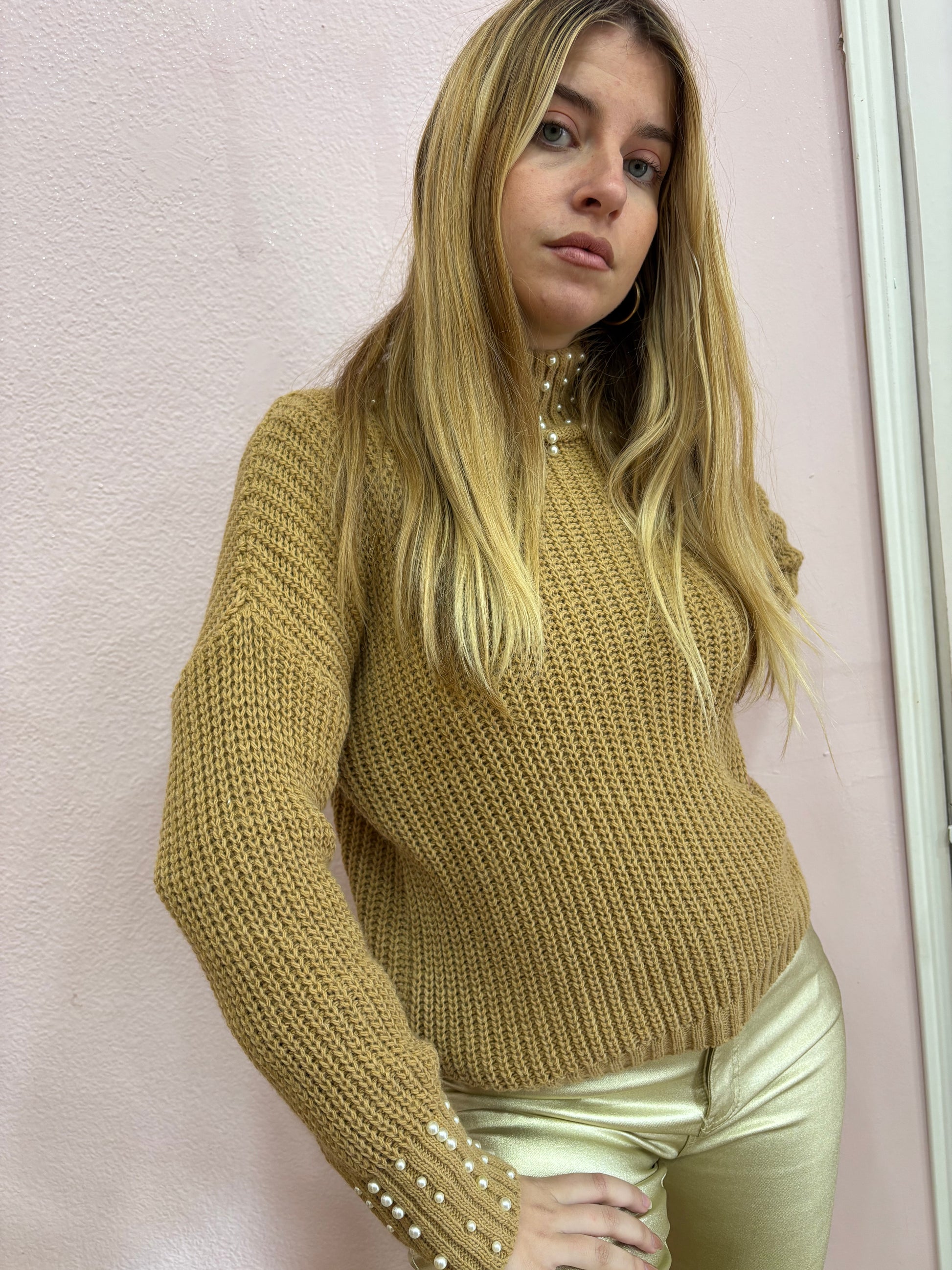 Jersey de punto adornado con perlas en los puños y en el cuello, de color camel. Talla única