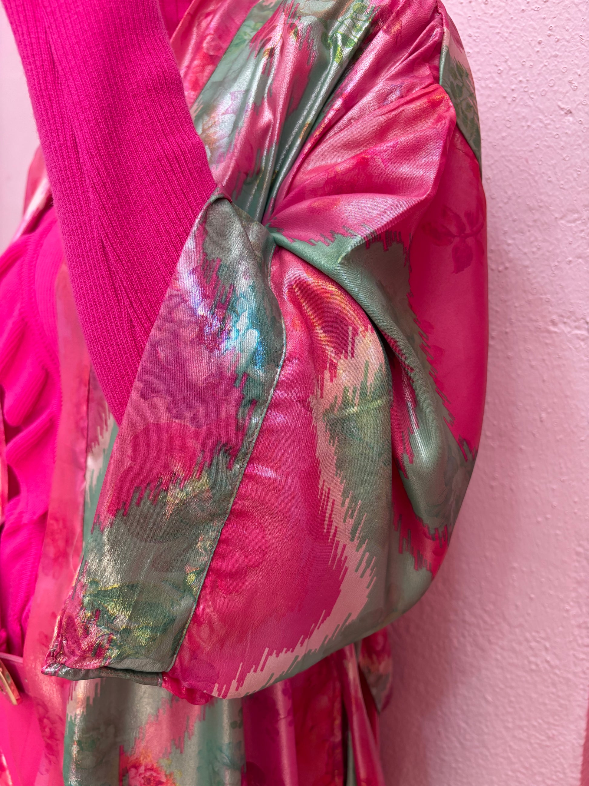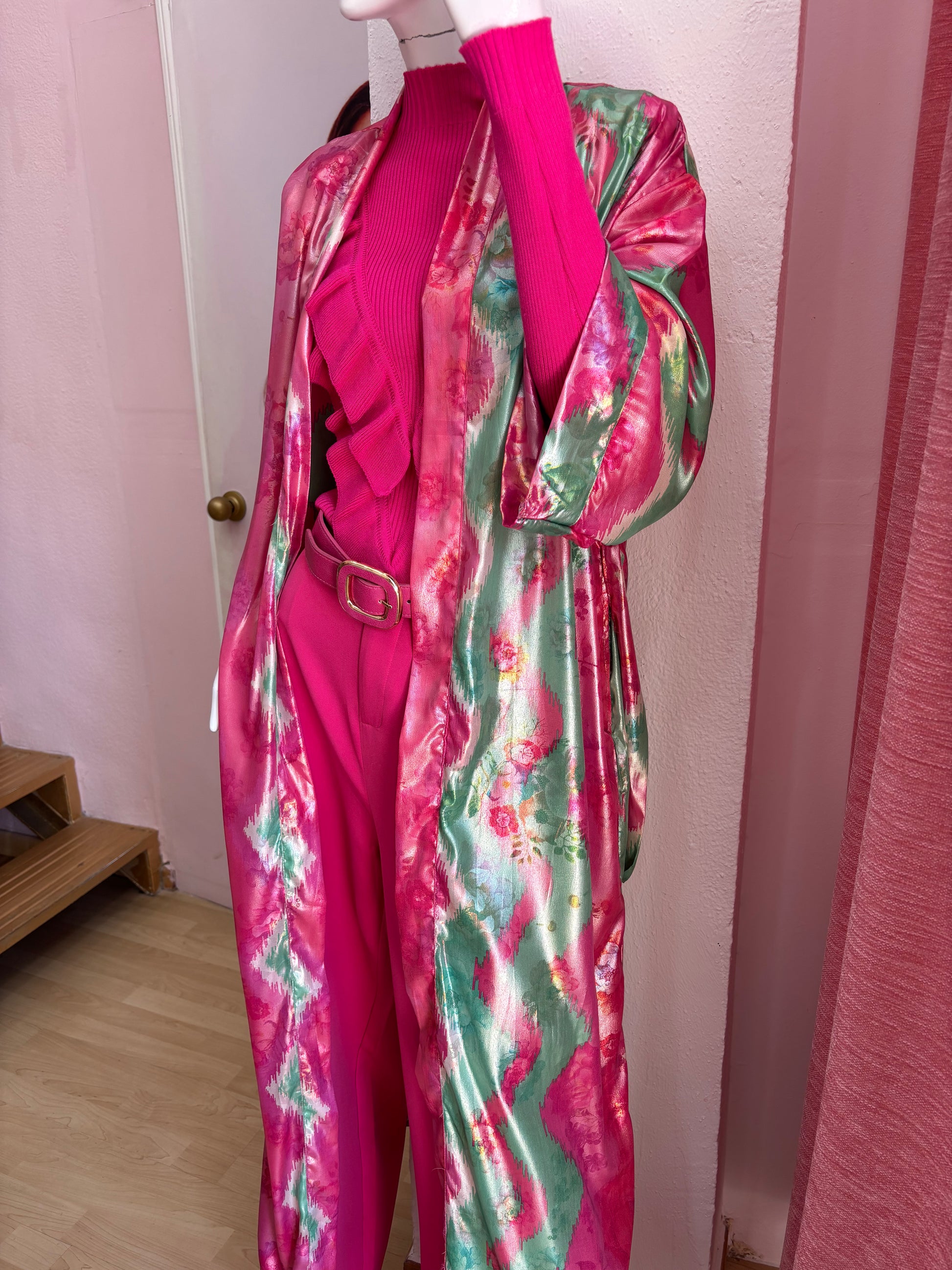 Kimono largo anudado con un citurón del mismo tejido . Estampado en tejido satinado en color verde y rosa .