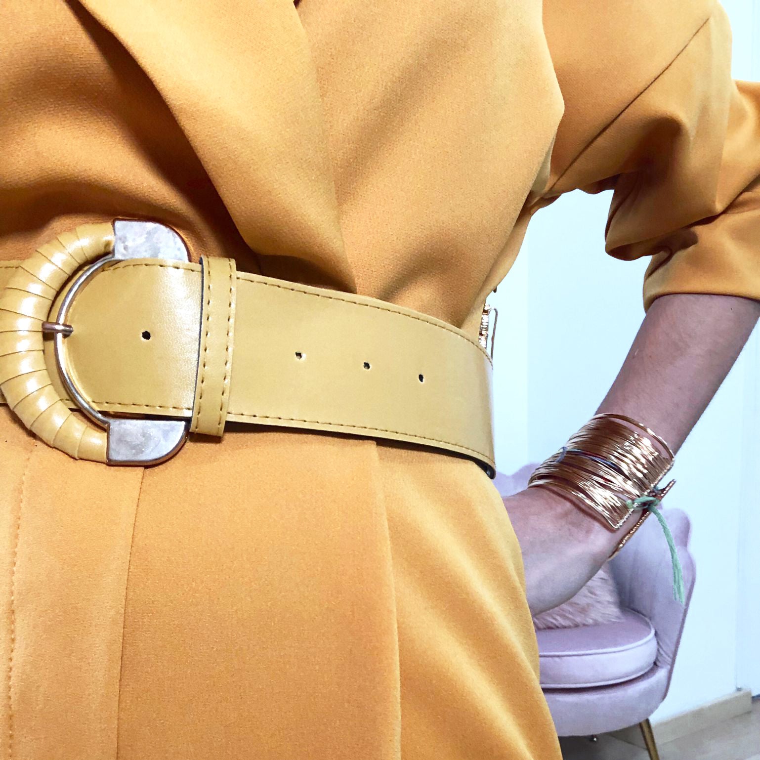 Mono de manga larga de color amarillo mostaza.Manga larga y cinturón de piel sintetica .Cuello con solapas cruzadas