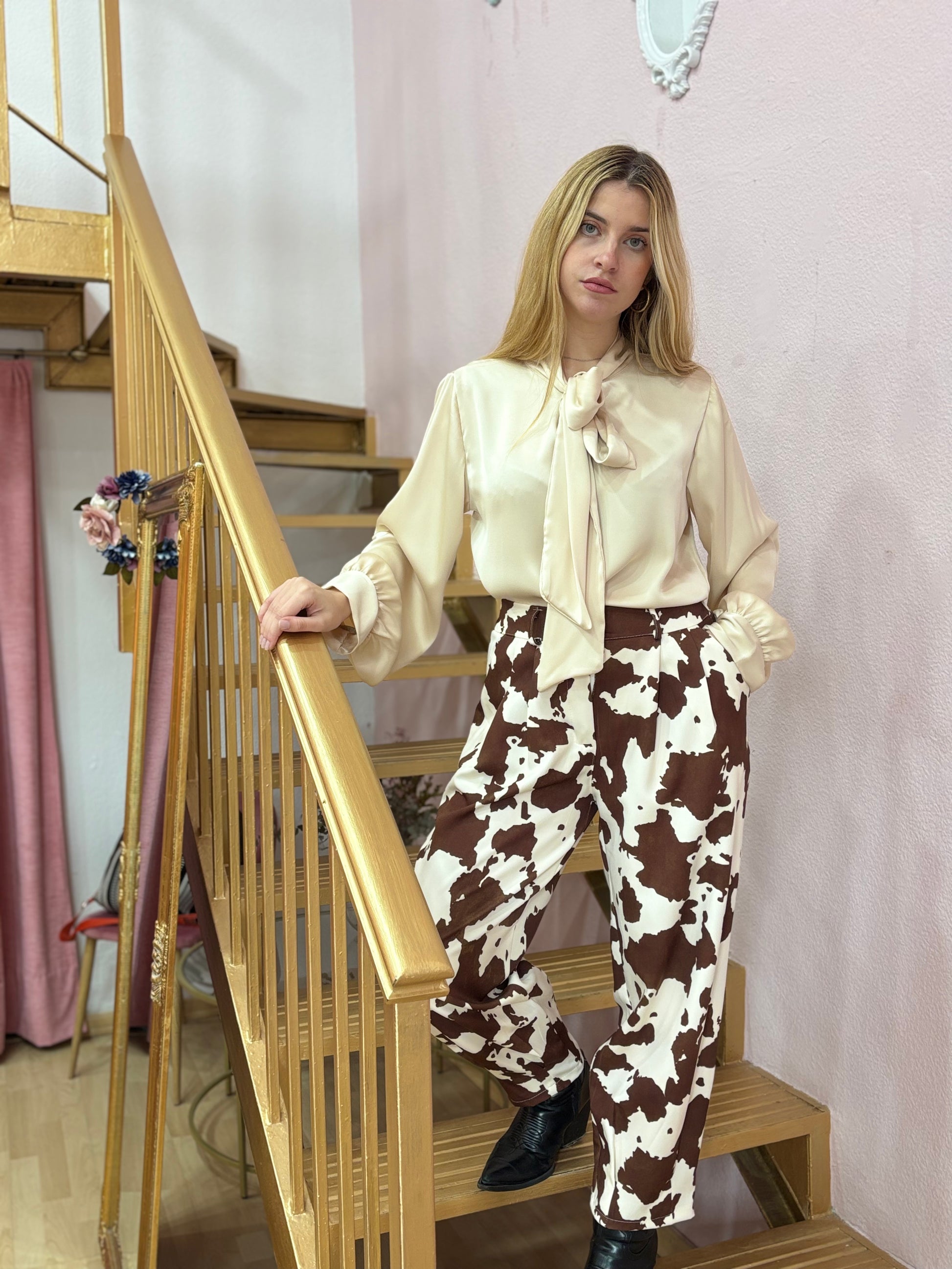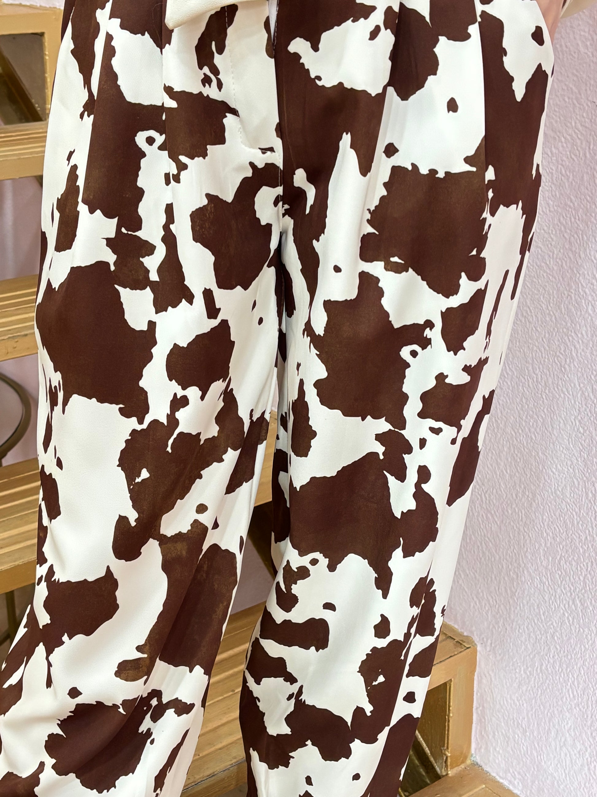 Pantalón de estampado vaca de color marrón . Talla ünica amplia. 38-42 aprox. Con tejido elástico.