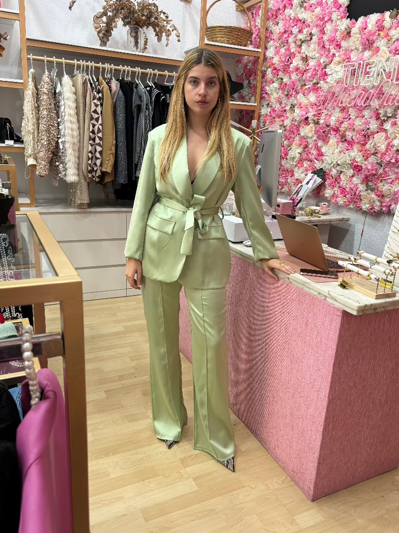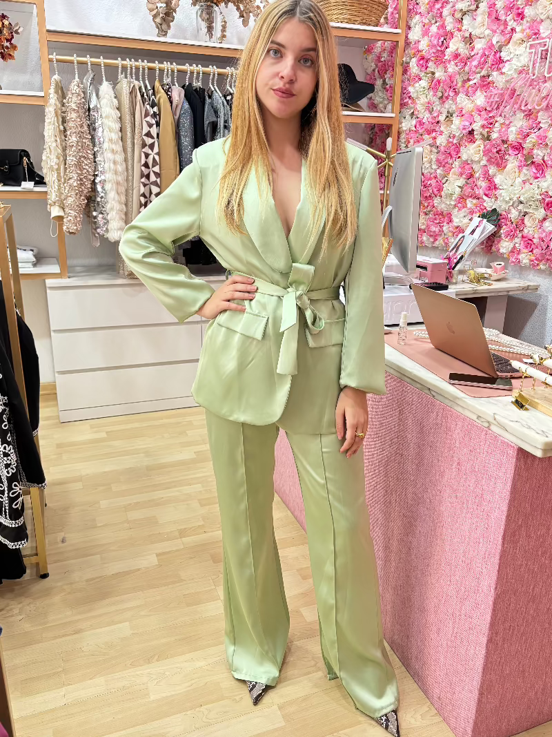 Pantalón satinado largo hasta los pies y acampanado. Cintura con elastico en la espalda.talla