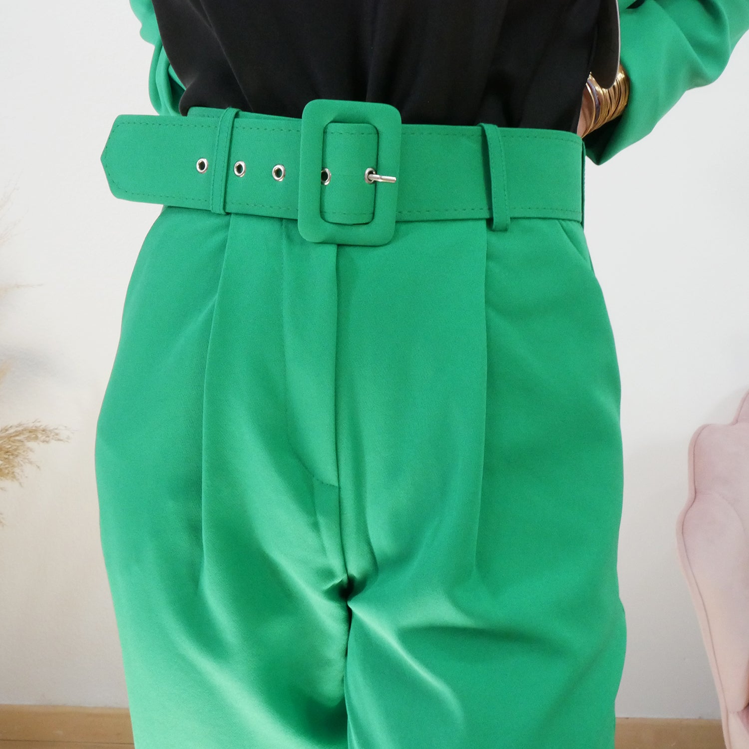 Pantalón de tiro alto , largo hasta el tobillo. Incluye cinturón .Color verde .