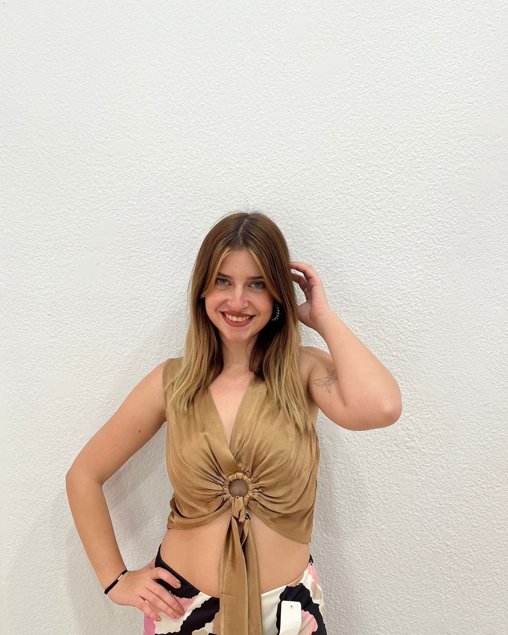 Top en tejido satinado ,corto. Ideal para llevarlo solo o debajo de un blazer .Color dorado.Talla única