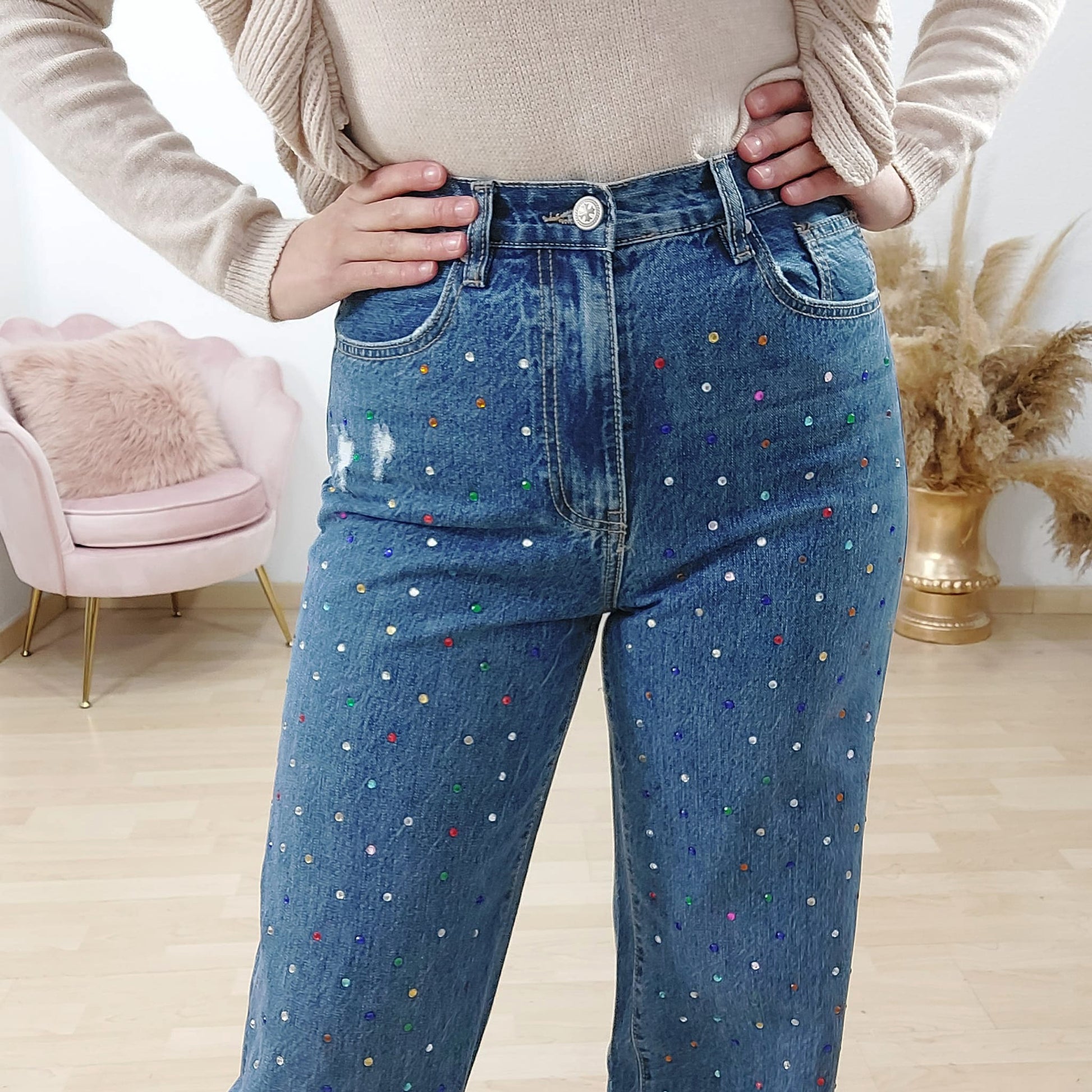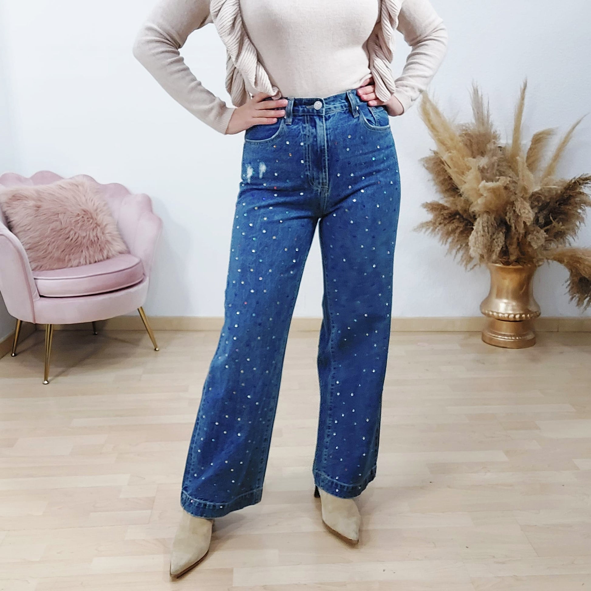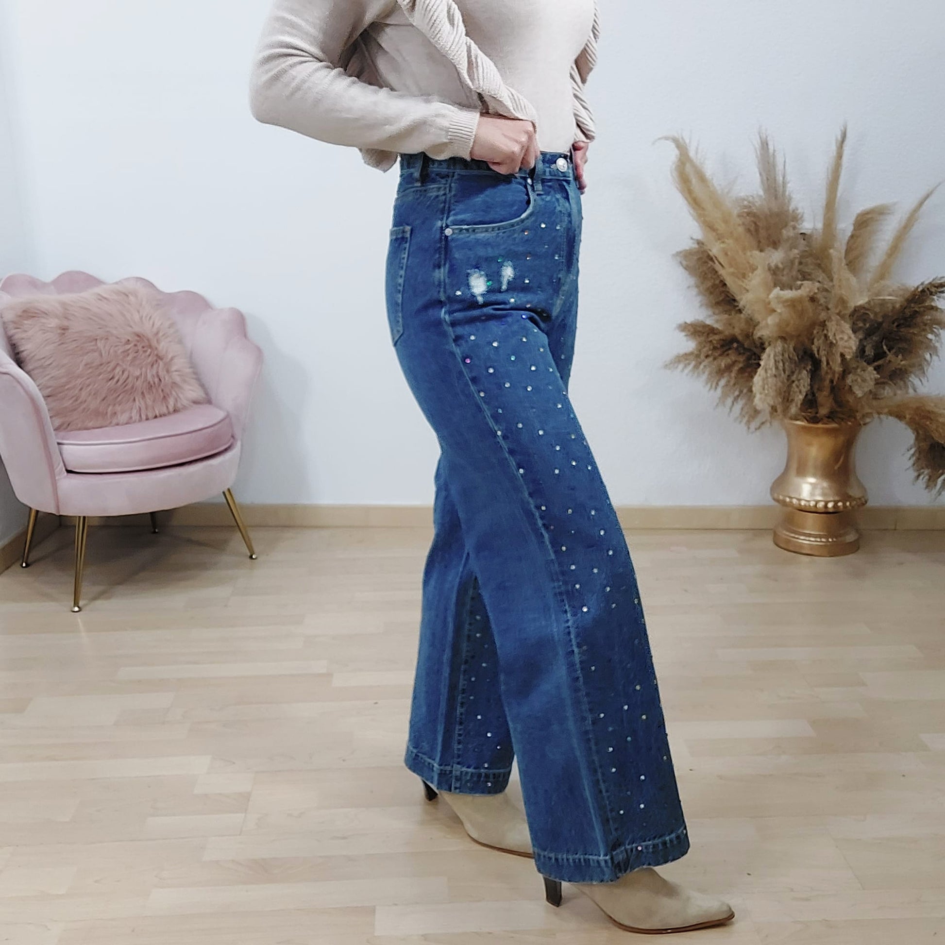 Pantalon vaquero ancho de pierna . No contiene elastano. Color azul medio y brillantes en la parte delantera del pantalón..