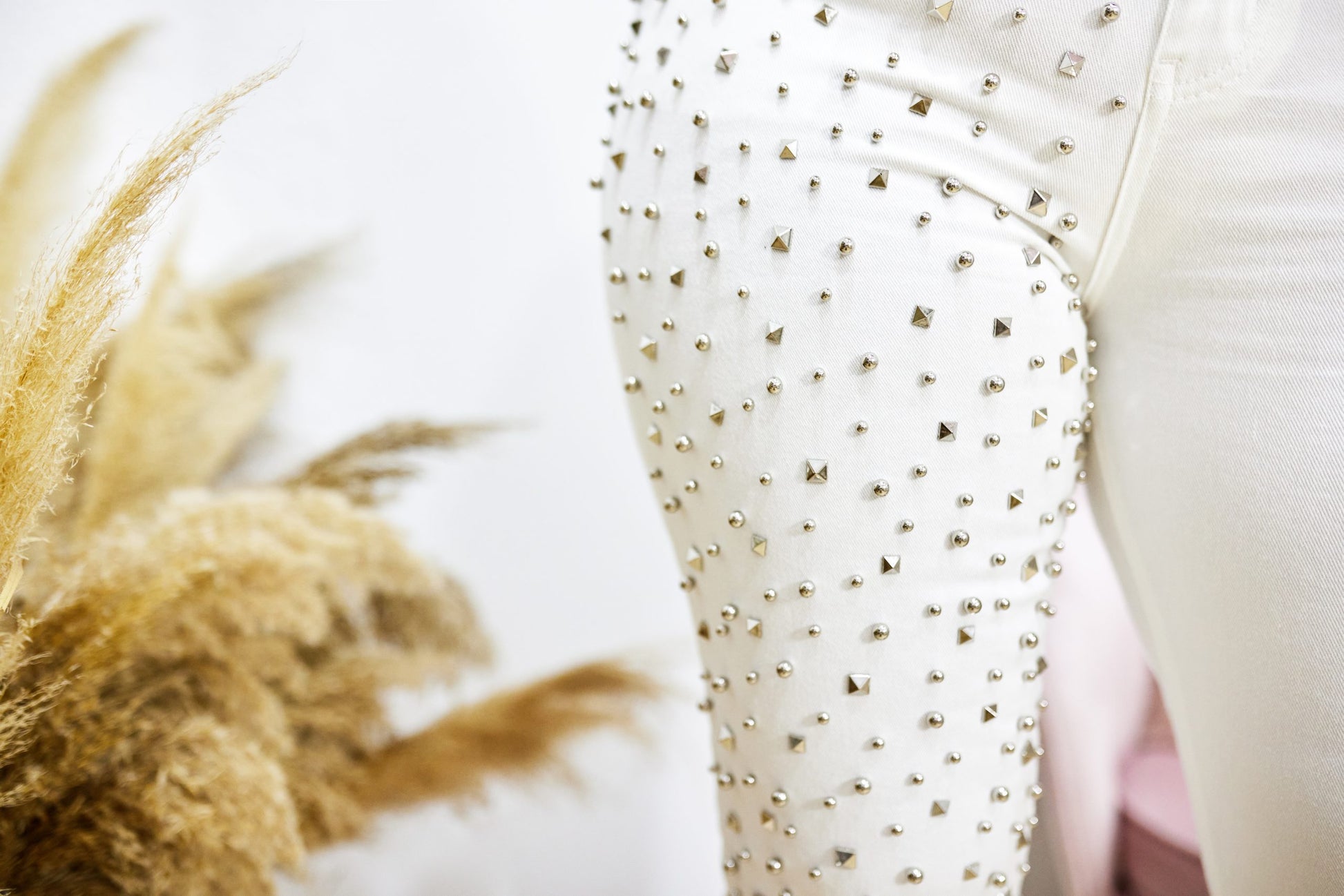 Vaquero en color blanco con tachuelas plateadas. Corte recto hasta el tobillo.Contiene elastano.