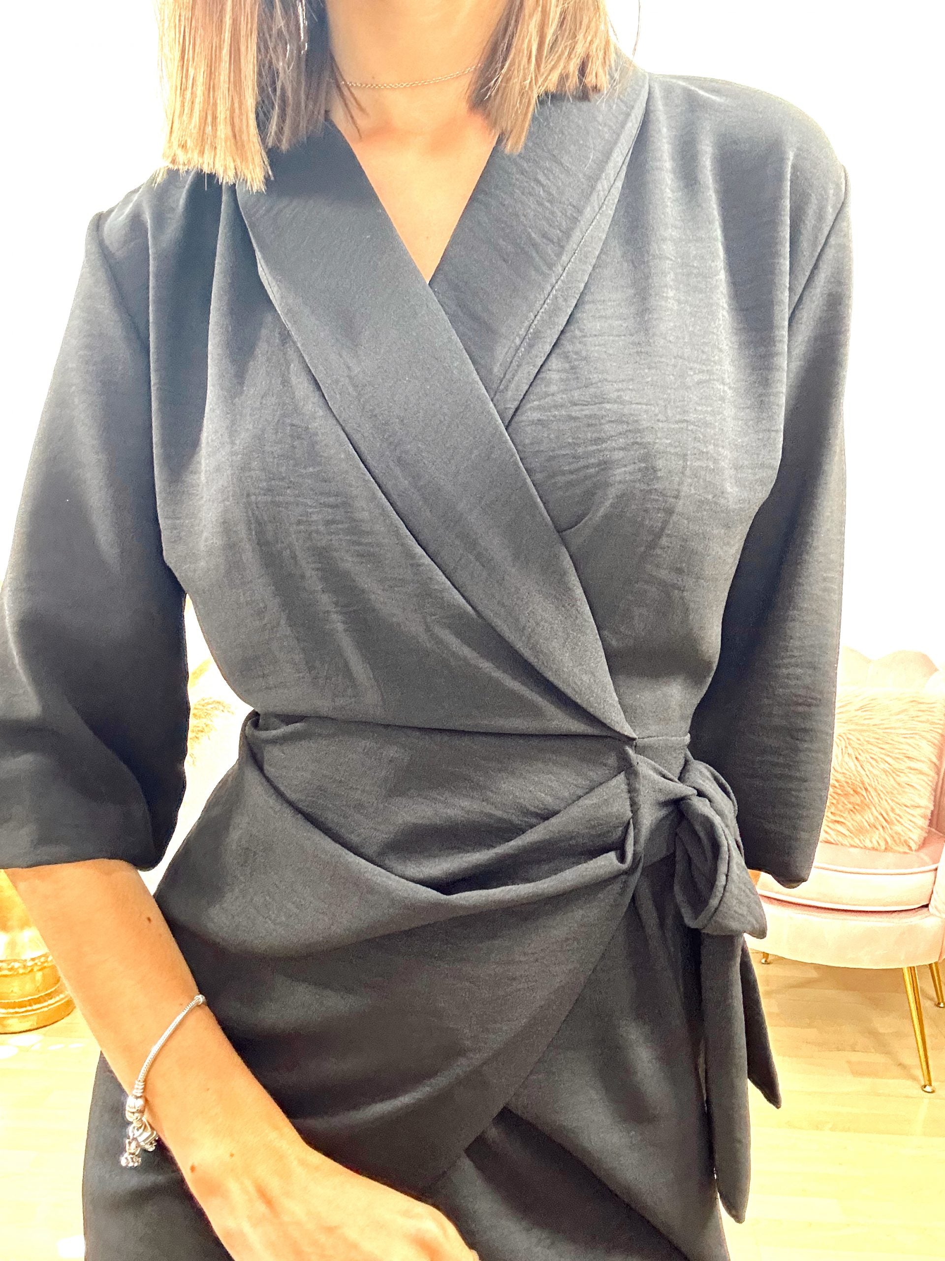 Vestido corto con lazada en lateral haciendo cruce. cuello de solapa . Color negro y talla única.
