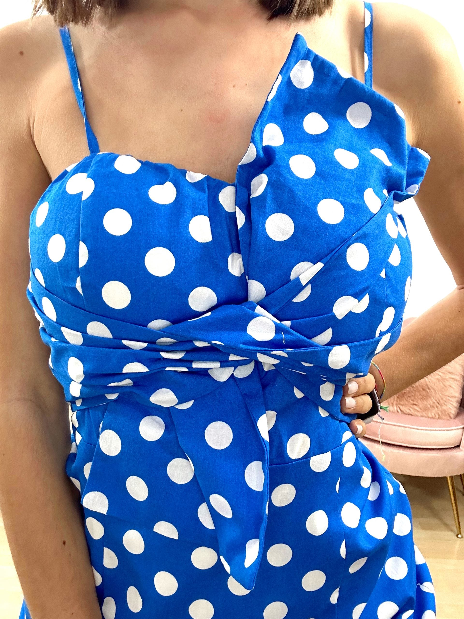 Vestido de tirantes ajustables y con un gran lazo en el pecho que lo hacen muy coqueto.Viene forrado .estampado de lunares en blanco y fondo azul.