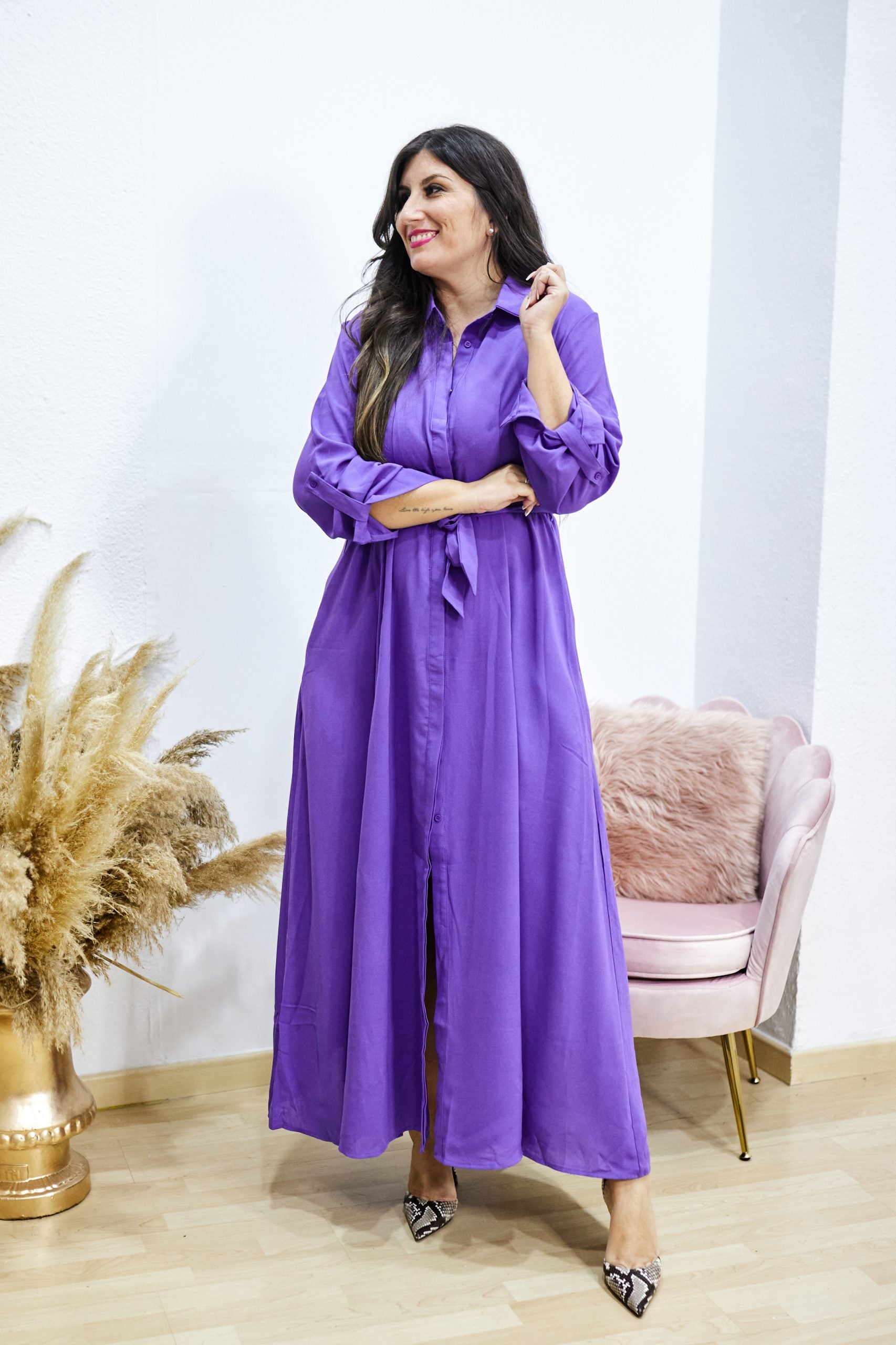Vestido fluido anudado en la cintura. Abotonado y con cuello camisero. Color morado.